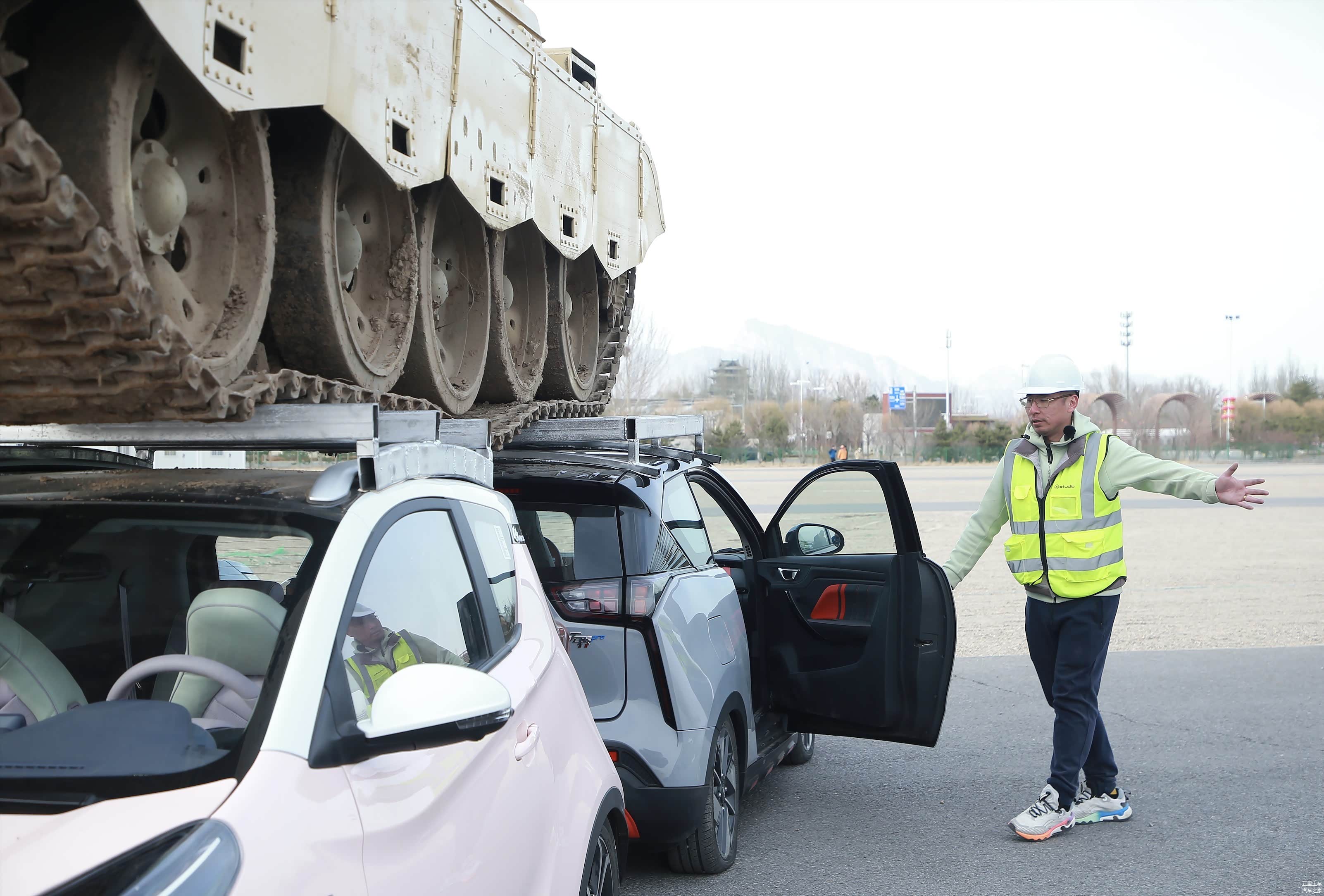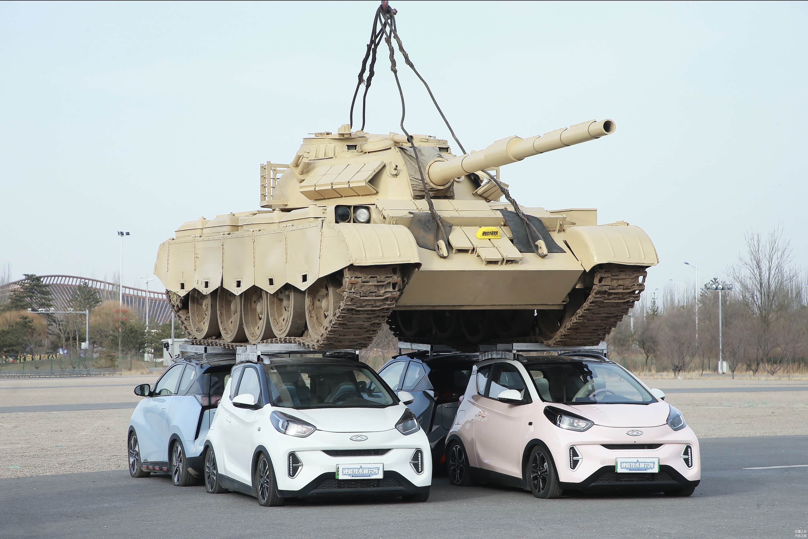 首先,我们先看看这次测试的具体情况。在测试中,使用的是两台奇瑞小蚂蚁和两台奇瑞无界Pro,托举的坦克是一款T59坦克,军迷朋友对这款坦克应该非常熟悉了,全重在36吨左右,测试中的T59坦克是经过改造的,坦克的反应装甲、炮塔内设施、炮管等都是改造过的,并没有原有的功能,是作为军迷体验项目使用的,但坦克正常驾驶还是可以的。整个测试用坦克经过改造后还是有30吨左右的重量。