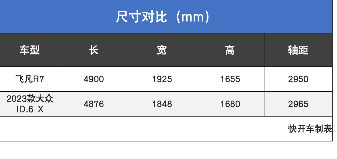 首先就是针对空间方面的对比。我们不难发现,两款车型的三维尺寸和轴距水平各有千秋,其中大众ID.6 X的高度和轴距更出众,而且提供七座布局,其实用性更胜一筹。飞凡R7的长度和宽度更明显,但整车的跨界风格决定了其不能采用七座布局,另外后备厢空间也受到了限制。