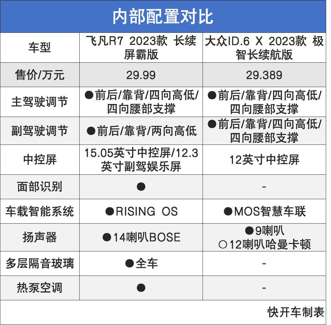 为了让大家更清楚地看出两者的配置水平,开车君选择指导价为29.99万元的飞凡R7长续屏霸版与指导价为29.389万元的极智长续航版进行对比。