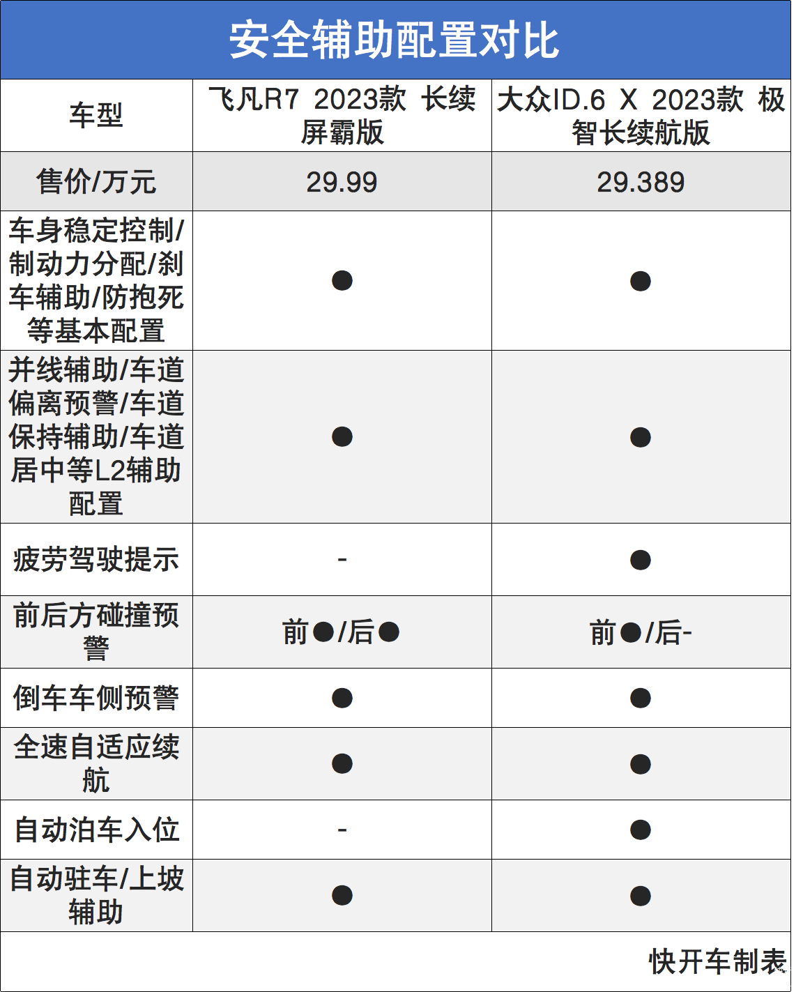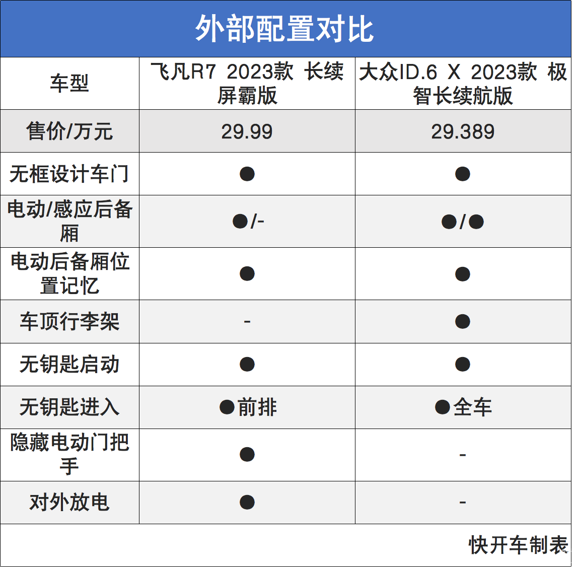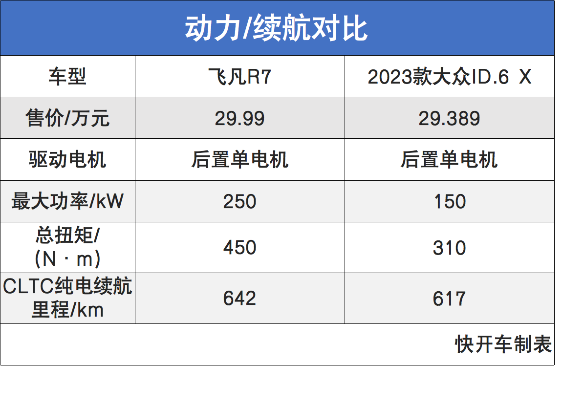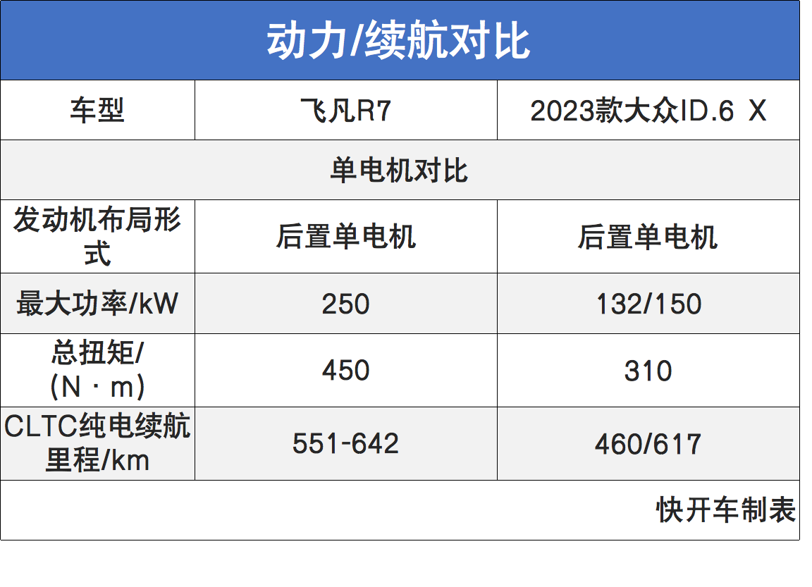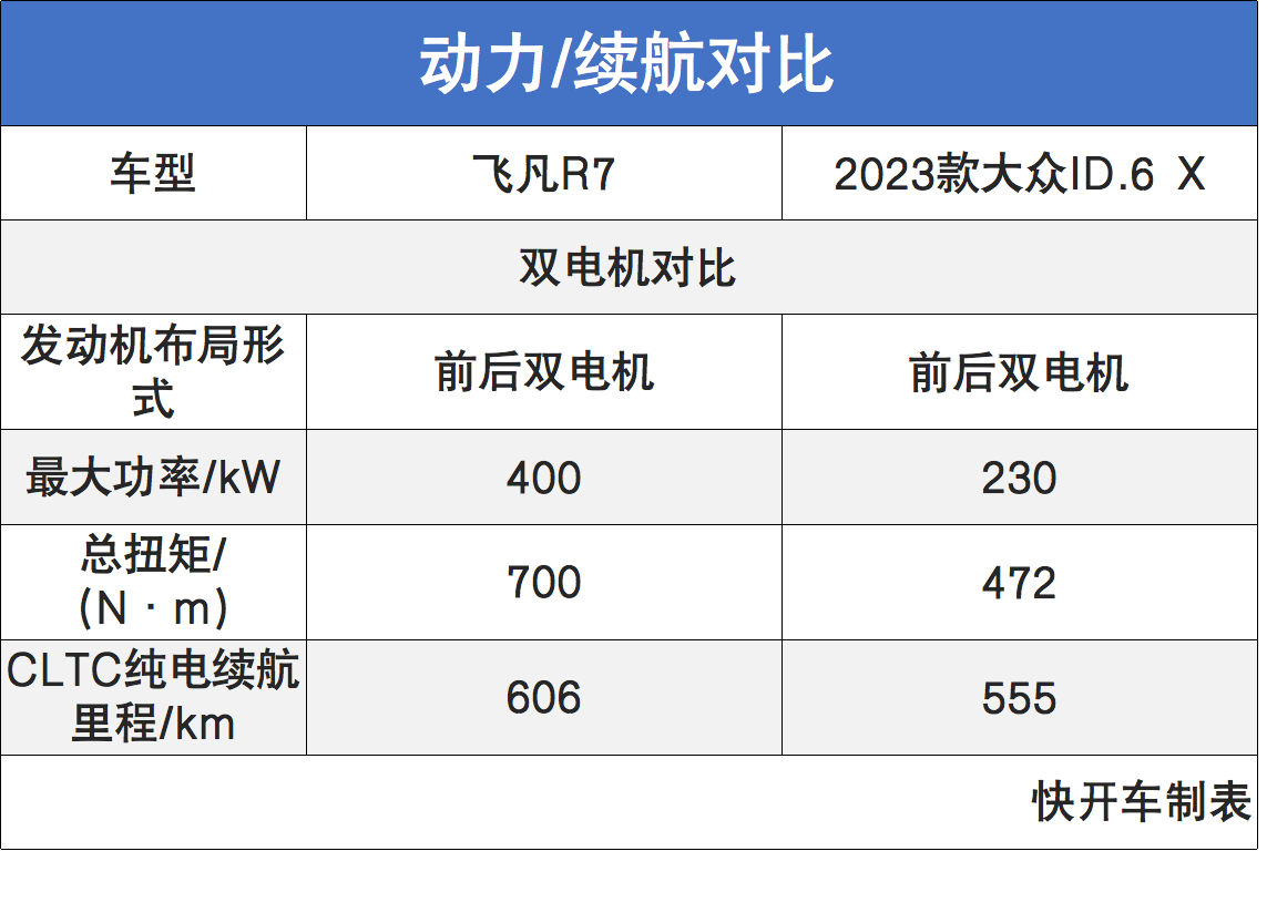 不过开车君发现,飞凡R7无论是后驱版还是四驱版,性能都要比大众ID.6 X要强。续航方面,两者在CLTC工况下的纯电续航里程都在500km以上,但综合来看飞凡R7还是略胜一筹。