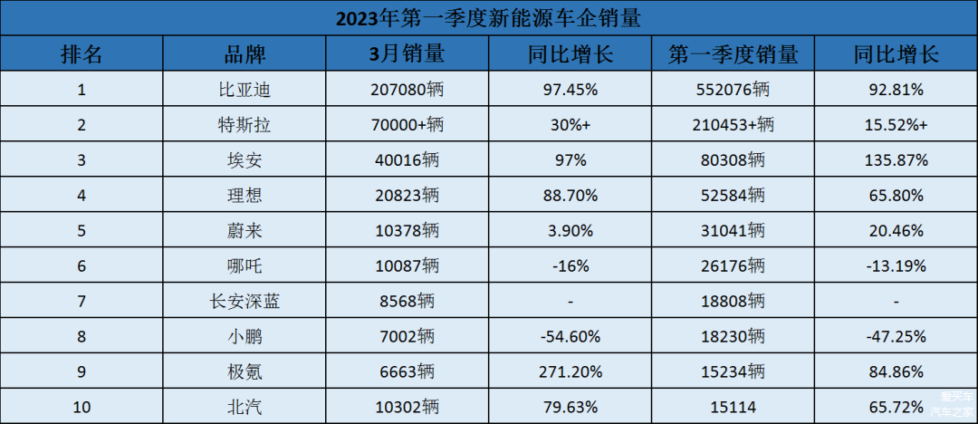 除了头部新势力品牌,传统车企也在奋力奔跑。其中,比亚迪的成绩继续遥遥领先,3月份销量高达207080辆,同比增长翻番,而在今年一季度,比亚迪的累计销量也高达552076辆,同比增长92.81%,坐上冠军位置是十拿九稳的事情。而与比亚迪一同强势发展的品牌还有埃安,3月销量达到40016辆,同比增长97%,环比增长33%。据悉,今年一季度,埃安销量已突破8万辆,同比增长79%。