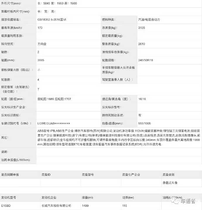 根据申报参数,可以肯定的是,这款尺寸超过5米轴距超过3米的大型MPV将搭载魏派蓝山上的插电混动系统,高山DHT-PHEV,1.5T发动机与P4电机组成的插电式混动系统,最大输出功率为380kW,最大扭矩933牛·米。