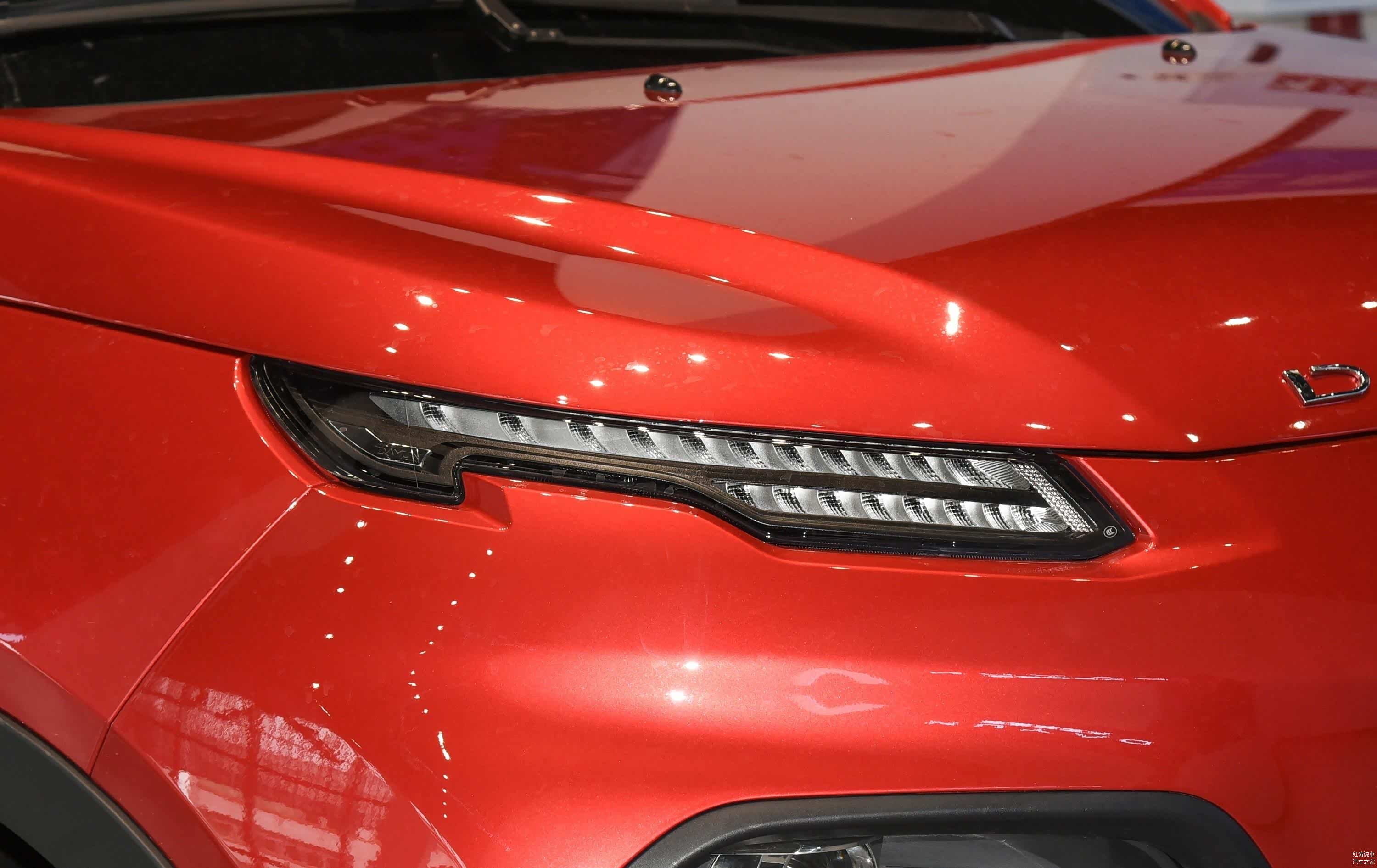 大运悦虎的外观设计很个性,甚至是有些另类,尤其是车头,总感觉怪怪的,但还是挺吸引人的!呵呵,前脸盖板下面是充电口,采用了分体式灯组,灯罩进行了熏黑处理。