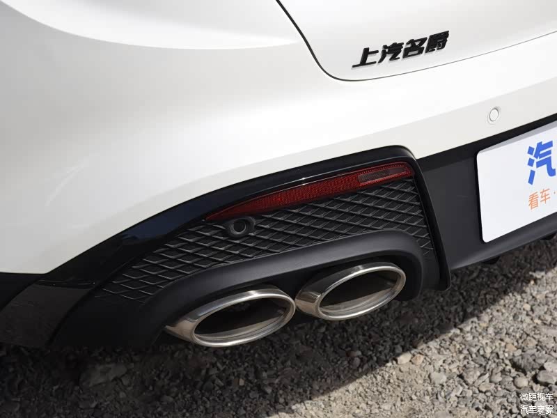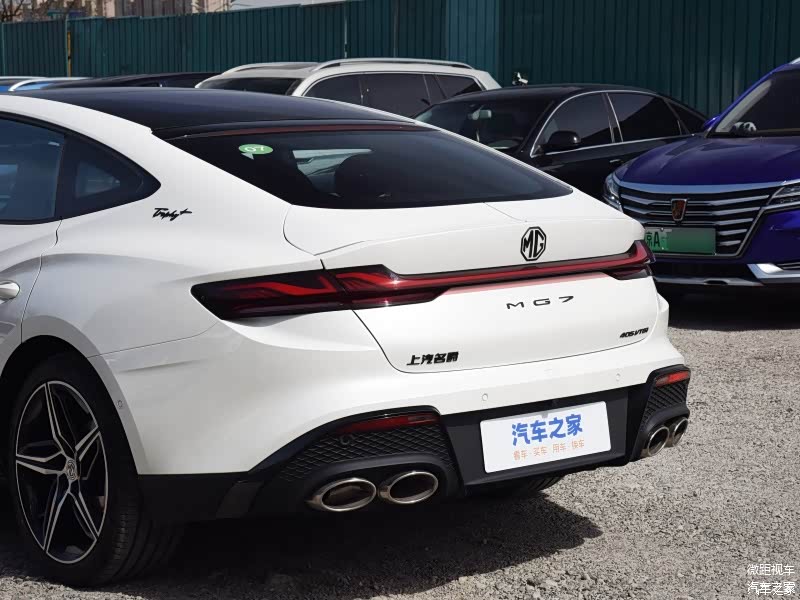车尾部分,名爵MG7的设计元素同样足够大胆激进,虽然中配1.5T DCT至美豪华版用不到电动三段式的大尾翼和双边共四出大排气,但是该车的造型元素还是安排到位,上方有静态的小鸭尾,下方虽然只有两个排气是真实的,不过四排气和大扩散器的装饰都没有缺席,同时立体的贯穿式尾灯,以及熏黑的车型品牌标识都是全系标配。