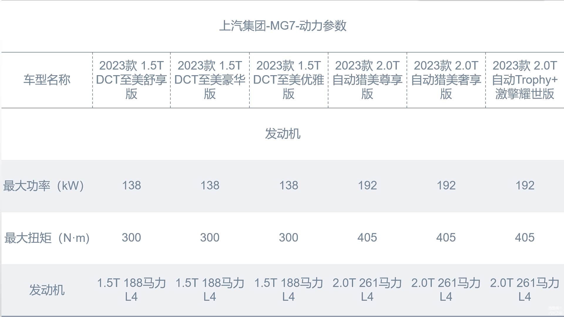 动力方面,名爵MG7 1.5T DCT至美豪华版搭载的是前置前驱发动机,发动机最大功率为138千瓦,最大马力188匹,峰值扭矩为300牛·米,传动系统匹配的是7挡湿式双离合变速箱,虽然性能参数比不过261马力的2.0T发动机,不过作为家用车来说,1.5T+7DCT的组合也是一点都不弱了。