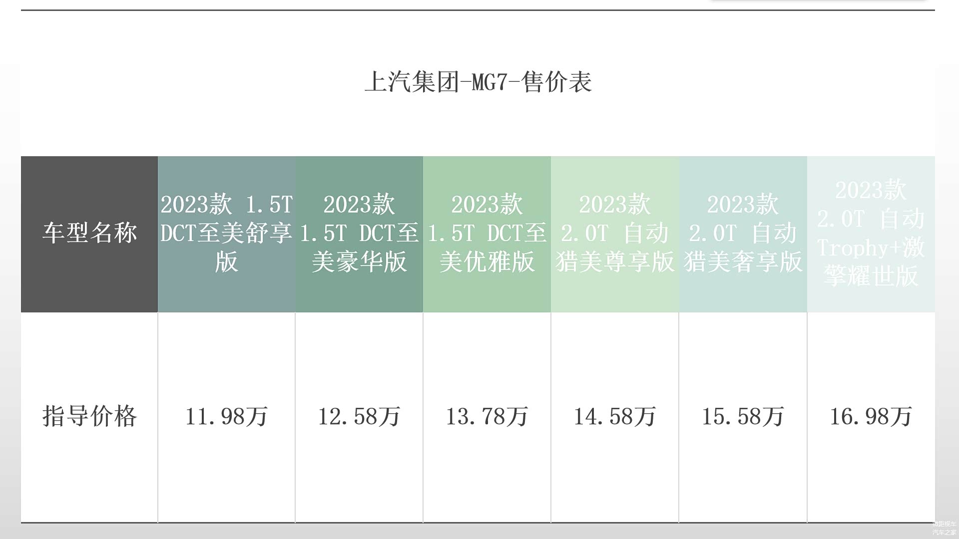 名爵MG7定位纯燃油中型轿车,采用大溜背轿跑造型,主打运动外观,同时兼顾家用车属性。新车共推出6款车型,1.5T+7DCT,2.0T+9AT两个动力总成各有3款车型,其中1.5T车型的官方售价区间为11.98万-13.78万元,2.0T车型则是定价14.58万-16.98万元。