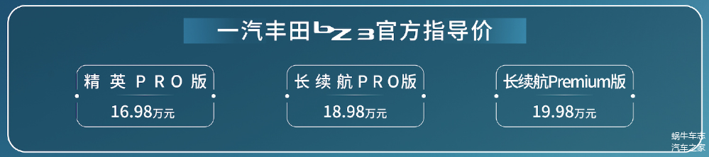 bZ3已公布了官方指导价,为16.98万-19.98万元。在当前虚高的电动车价格里,还是挺香的。对了,提醒一句,BZ3是一丰独占,广丰目前没有引进计划。