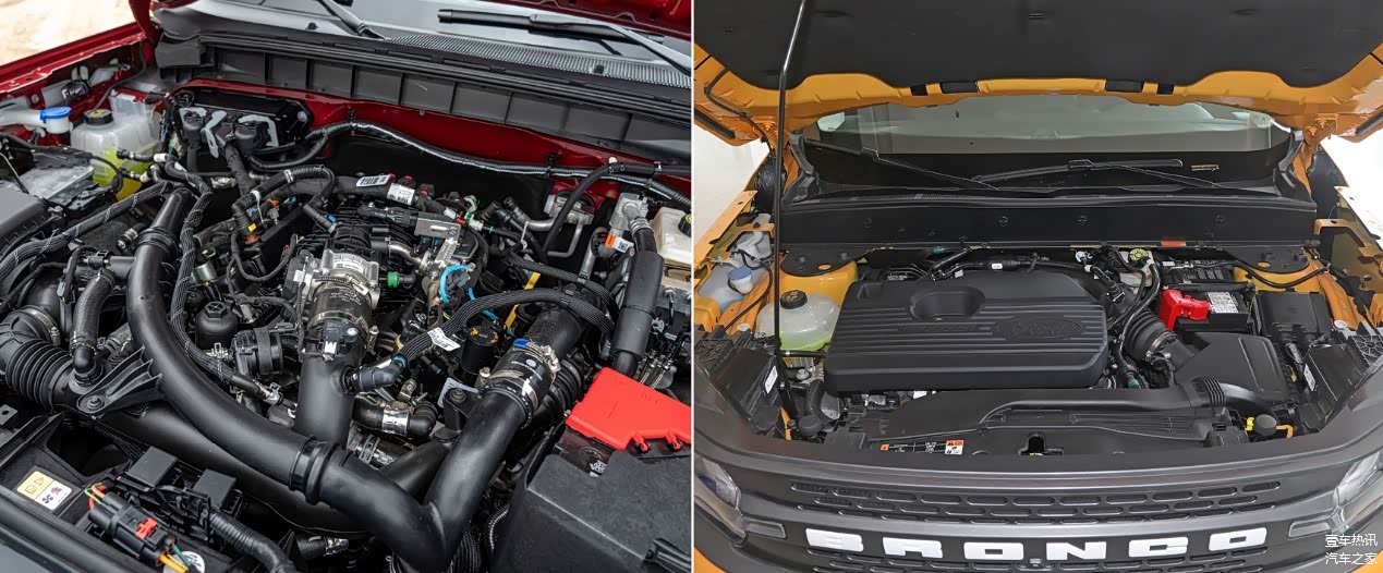 除了在取向方面有着巨大差异,在动力总成方面,这两款车也是差异明显。福特Bronco起步就是2.3T,高配采用2.7T双涡轮增压V6发动机,传动系统匹配7速手动变速箱(6个行驶档+1个专用攀爬挡)与10速自动变速箱。而福特BroncoSport则更加城市化,入门款仅采用1.5T三缸发动机;中高配车型将提供2.0T发动机,两种动力均匹配8AT变速箱。