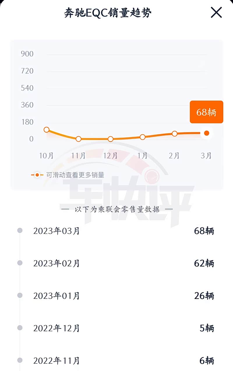 乘联会销量数据显示,2023年1~3月,奔驰EQC月销量分别是26辆、62辆和68辆,可见销量非常惨淡。