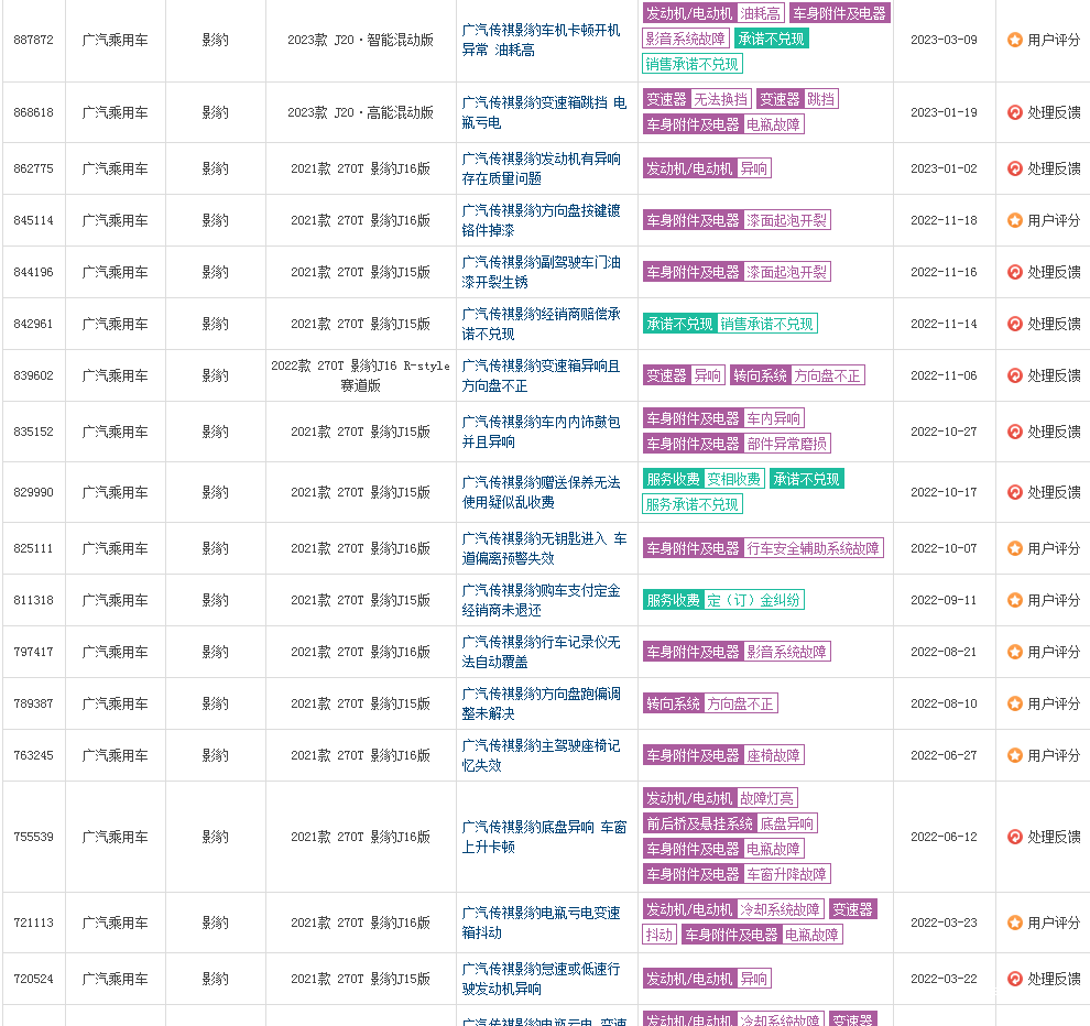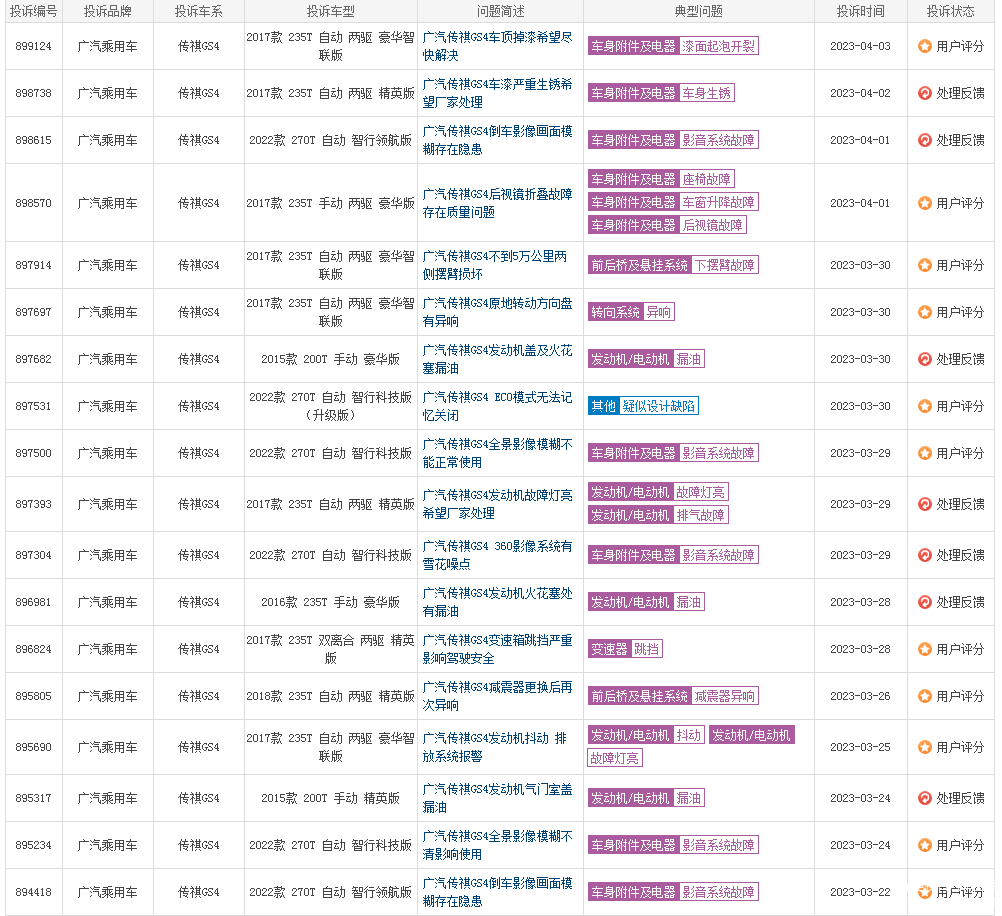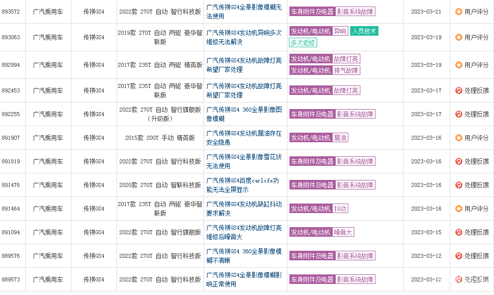 同时,与传祺GS4有关的投诉开始不断增加,根据第三方质量投诉平台车质网投诉信息显示,发动机故障、传祺GS4车身生锈、漆面掉落、影音系统故障、刹车异响、车窗升降故障等问题颇为严重。2022年,曾有159名车主集体投诉2022款广汽传祺GS4搭载的360影像系统夜晚模糊不清,全景影像基本全是“雪花”的问题。但已过去近一年的时间,诸多投诉平台仍有大量传祺GS4车主在投诉该问题,也有无奈的车主发帖吐槽。