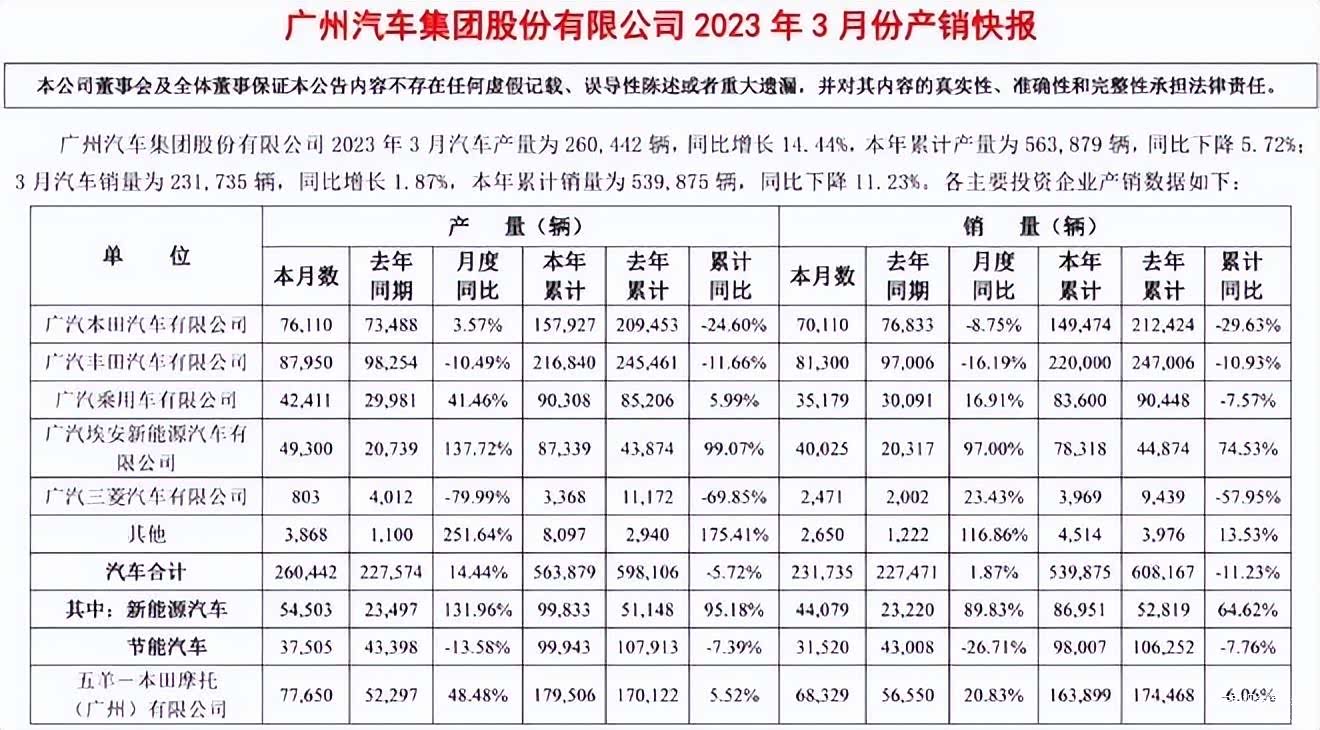 2023年一季度,广汽传祺累计销量83600辆,与去年同期的90448辆相比,下跌7.57%。而根据广汽集团此前披露的产销快报,1月份销量23277辆,同比下降36.34%;2月份销量25145辆,同比增长5.68%。前两个月销量48422辆,累计跌幅达到19.77%,下滑趋势较为明显。