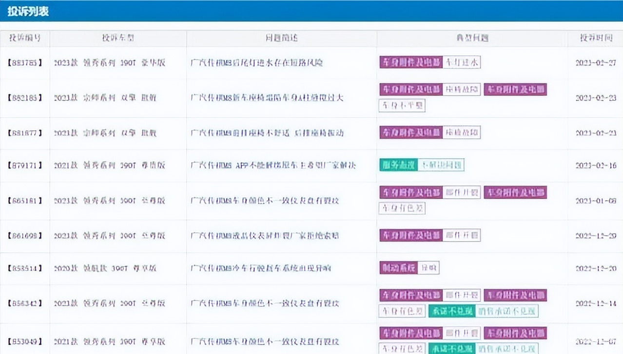 关于传祺M8的质量投诉问题,最多的就是车身附件及电器,比如座椅塌陷车身A柱缝隙过大、天窗漏水、门窗异响、部件开裂、车身生锈、车身有色差、车灯故障、后尾灯进水等,这些案例并不是个例,而是有多位车主均表示存在这样的问题。而在车质网5分为满分的用户满意度评分体系中,传祺M8仅有2.5分,显然口碑并没有那么令用户满意。