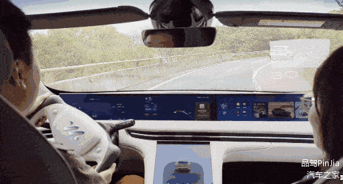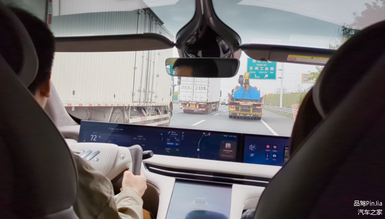 而在测试中,我所搭乘的这辆智己 LS7 在条件允许的情况下,能够一直保持在道路居中,不贴左靠右,根据弯道的变化灵活地完成了自动转向、增减速等操作,并且根据司机的手动选择(通过方向盘后方右侧的扳机)来保持符合司机期待的跟车距离。