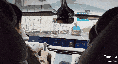 而我刚刚交出控制权的这辆车,从容不迫地跟左侧的大车保持了一米距离大约10秒之后,突然自己亮起了左侧转向灯,找准机会轻轻给了一脚油……电,然后地并入左侧车道两辆大车中间大约20米左右的空隙,完成了我至今都不敢进行的操作。