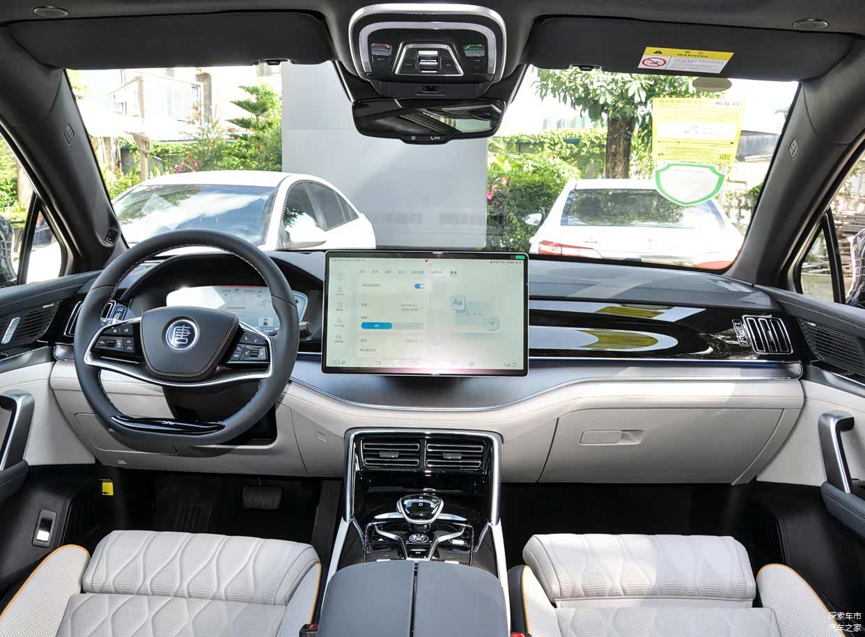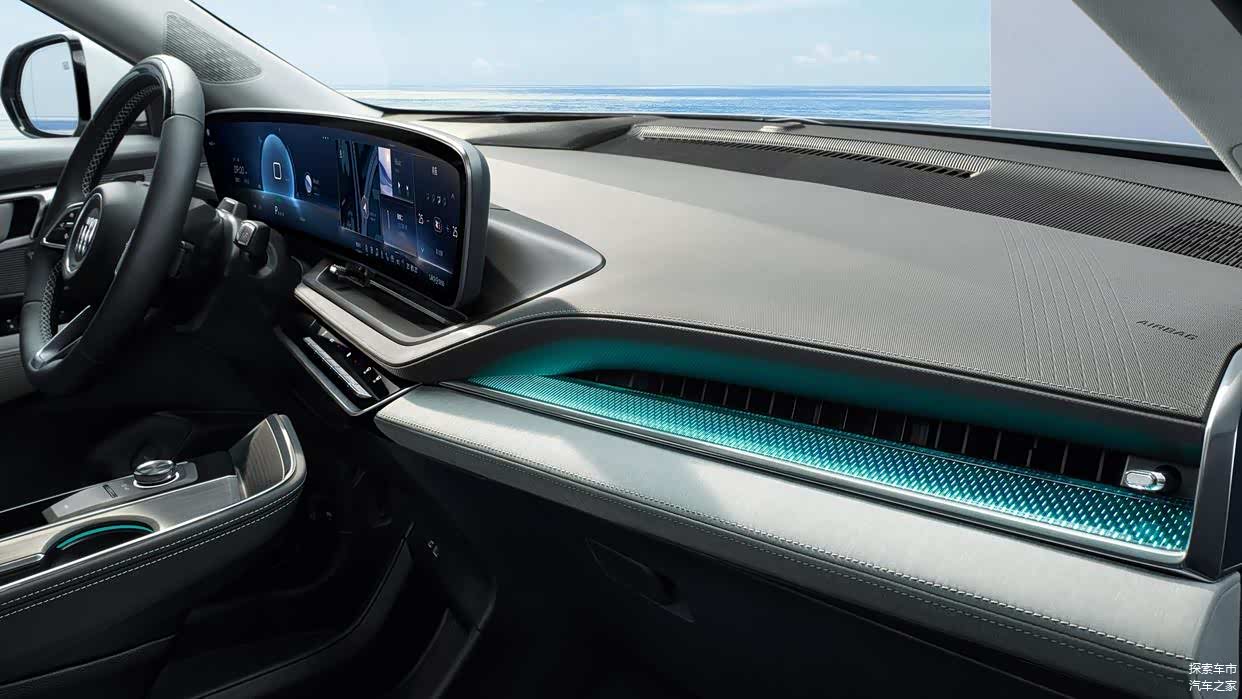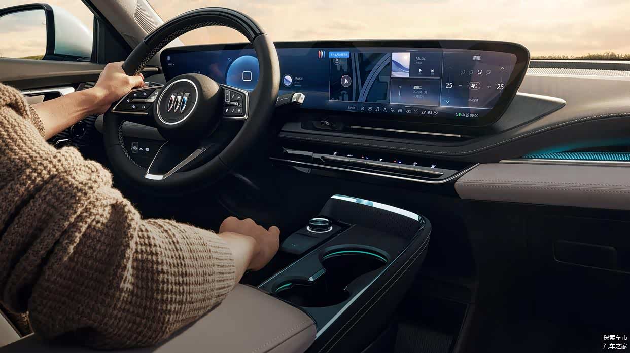 内饰部分,别克E5最显眼的莫过于全系标配的EYEMAX 30英寸一体弧面6K屏,不同于其他新势力品牌采用的三块屏拼接,作为同级唯一的高清弧面屏,显示效果相当霸气,配上可选择钢琴模式、流水模式和能量条模式的121色音乐律动氛围灯以及光舞晶阵饰板、12.6英寸HUD抬头显示系统,加上支持无线carplay和百度车联应用双生态车机系统,全系标配高通骁龙8155芯片,科技感甚至超过了自主品牌。
