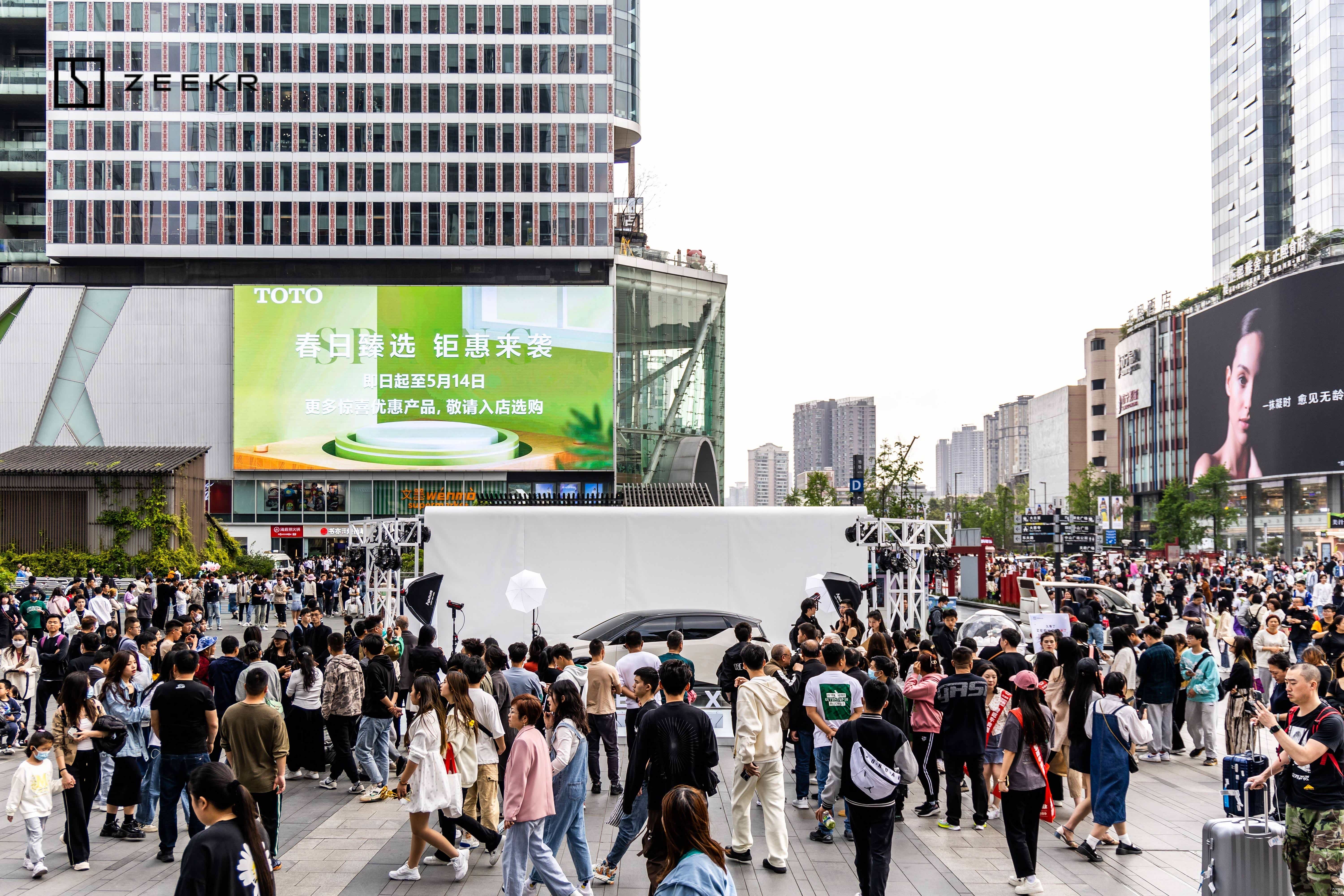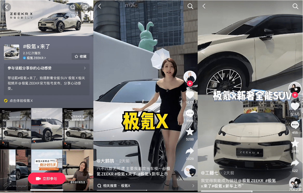 4月8日至9日,杭州万象城及成都春熙路两大潮流地标商圈,极氪X新车首秀线下快闪活动火热来袭,吸引众多达人及用户探展,此外,极氪在抖音同步上线相关话题#极氪x来了 ,搅动广泛车垂用户,将新车突破传统的无界美学理念强势传达至线上线下,引发车圈广泛关注。