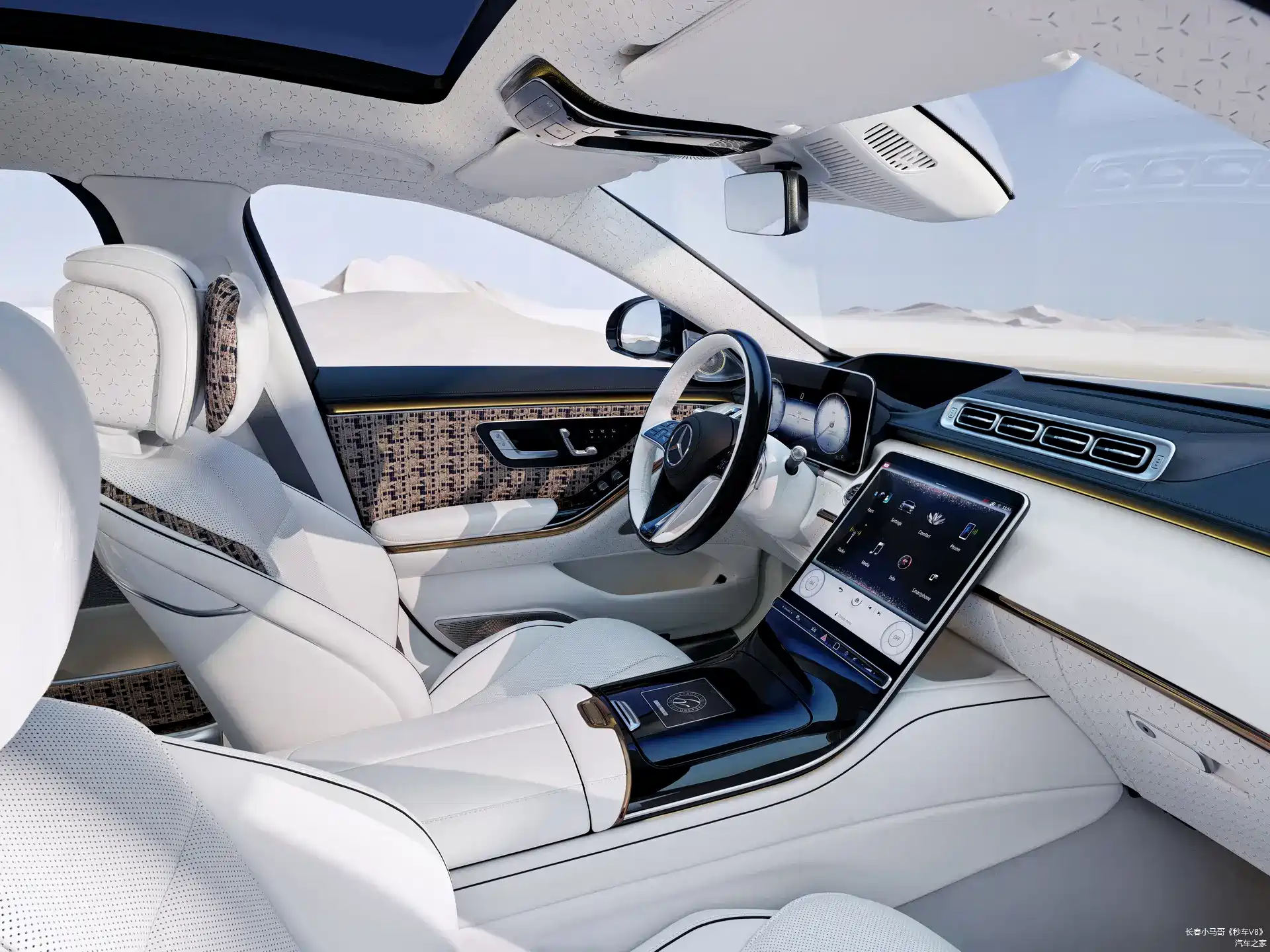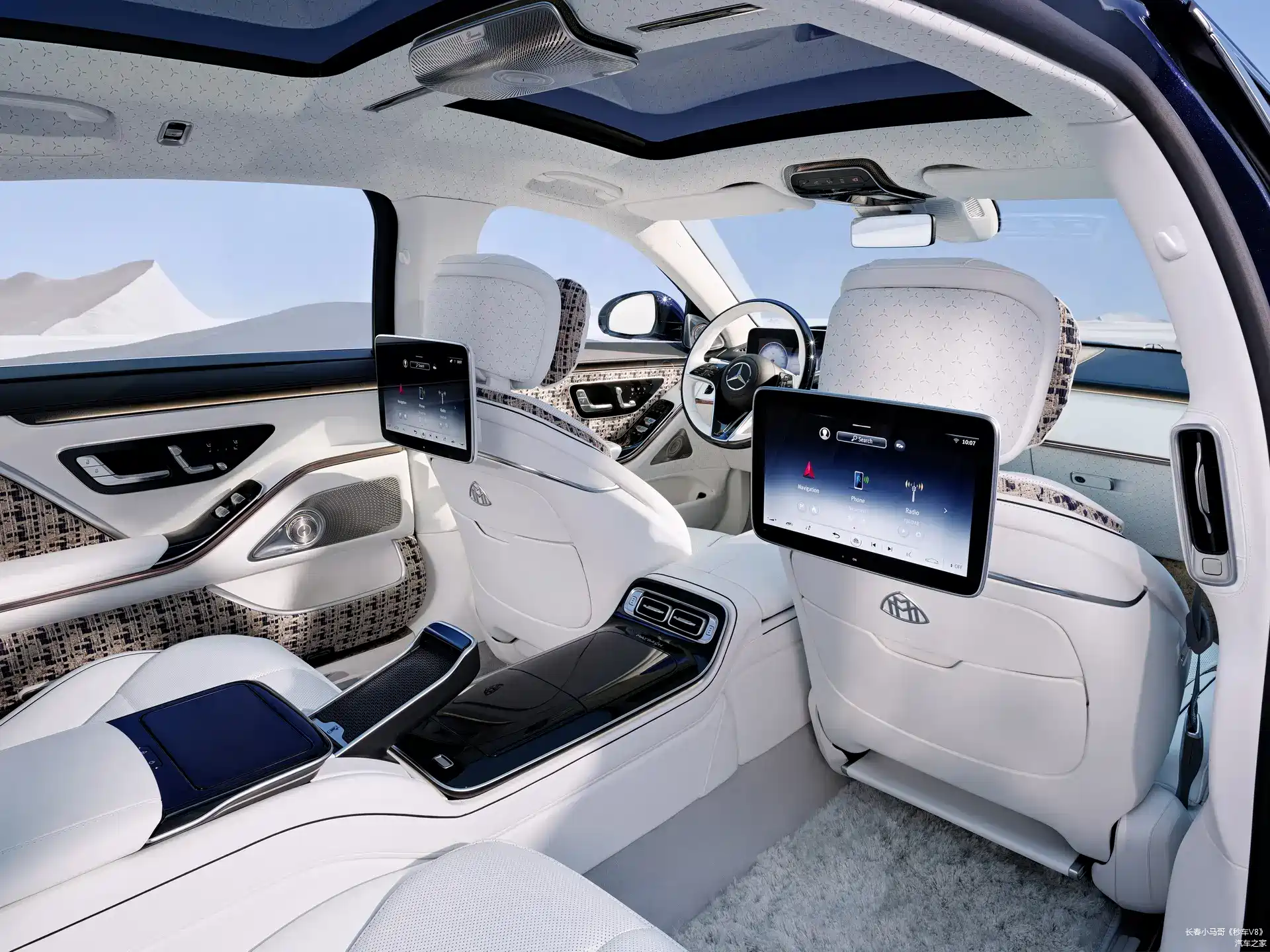 座椅、控制台和车门上的水晶,以及融入全车的白色皮革是欢迎乘客进入奢华环境的标志。与此同时,地垫由亚麻和马海毛制成,香槟杯呈玫瑰金色,车顶的天花板上反复出现梅赛德斯三点星形图案。