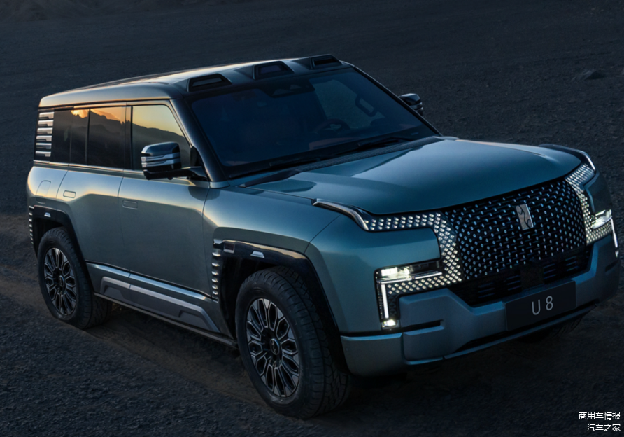 仰望U8前脸采用封闭式格栅设计,内部还采用点阵式装饰,大灯造型呈现出一个“鼎形”,十分独特;侧面前低后高,整体线条硬朗,呈现方正之感;尾部造型是一个长方形,备胎罩也是采用了八边形的设计,不显突兀。