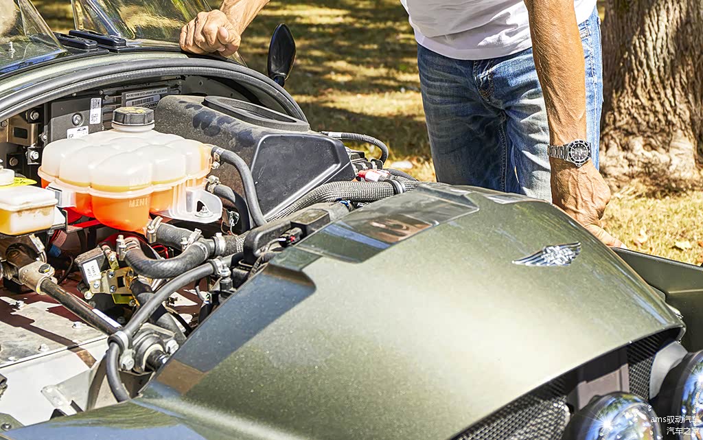 关于Super-3的旅程从常见问答环节开始,最常见的问题是:驾驶这款车我应该穿什么衣服?发动机在哪里?司机的右手肘怎么办,应该放在哪里?这玩意儿会不会翻车?当然还有各种七嘴八舌:是否有什么适合各种天气变化的配件等。是在前面藏着吗?可以伸出来吧?算了,把所有这些问题都抛在一边,预备,就绪,出发!感谢摩根特约大使约翰的悉心关怀,整个上车过程就如同0W40机油一样润滑。首先将右脚放在座椅下方的窄铝条上,然后是左脚,最后整个身体“滑入”这个类似“蚕茧”状但非常舒适的织物坐垫里。