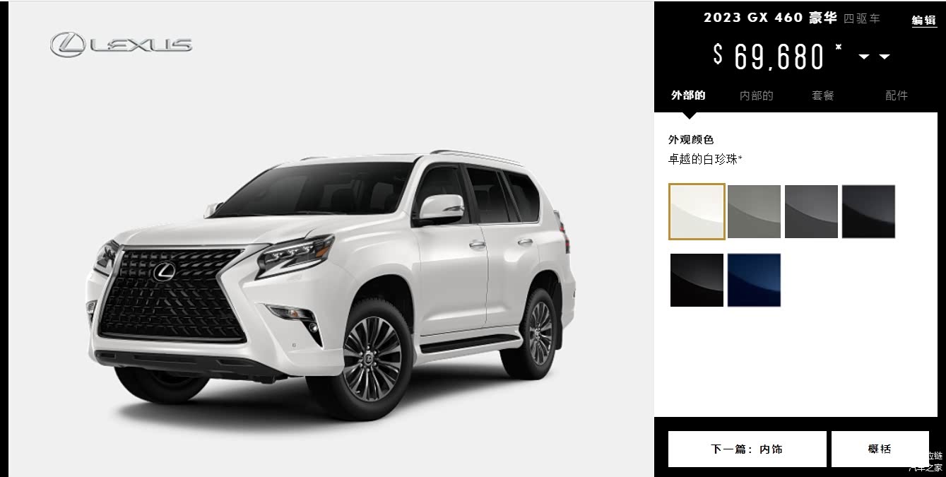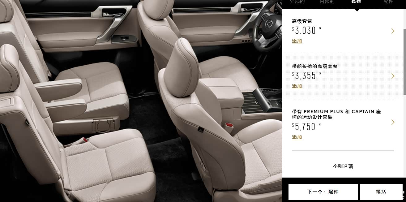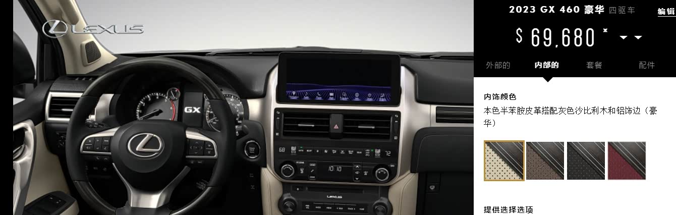 22款雷克萨斯GX460高级包:必选高级包$1,335 比标配高:三区自动气候控制、LED雾灯、加热和通风的前排座椅(车源较多,特别高级包最多,黑曜车不多)