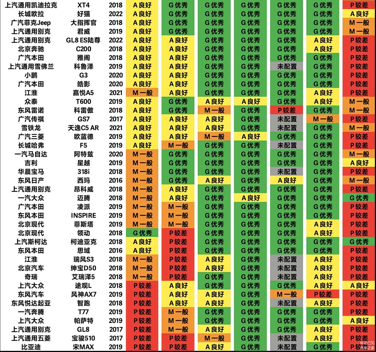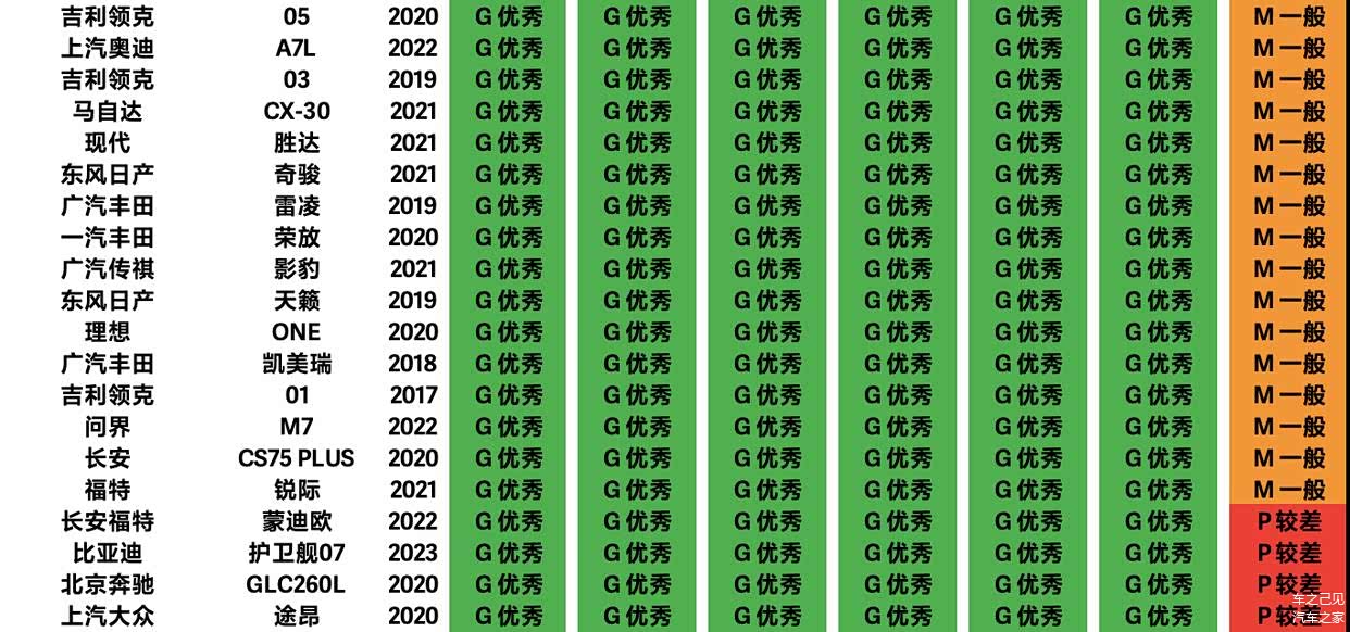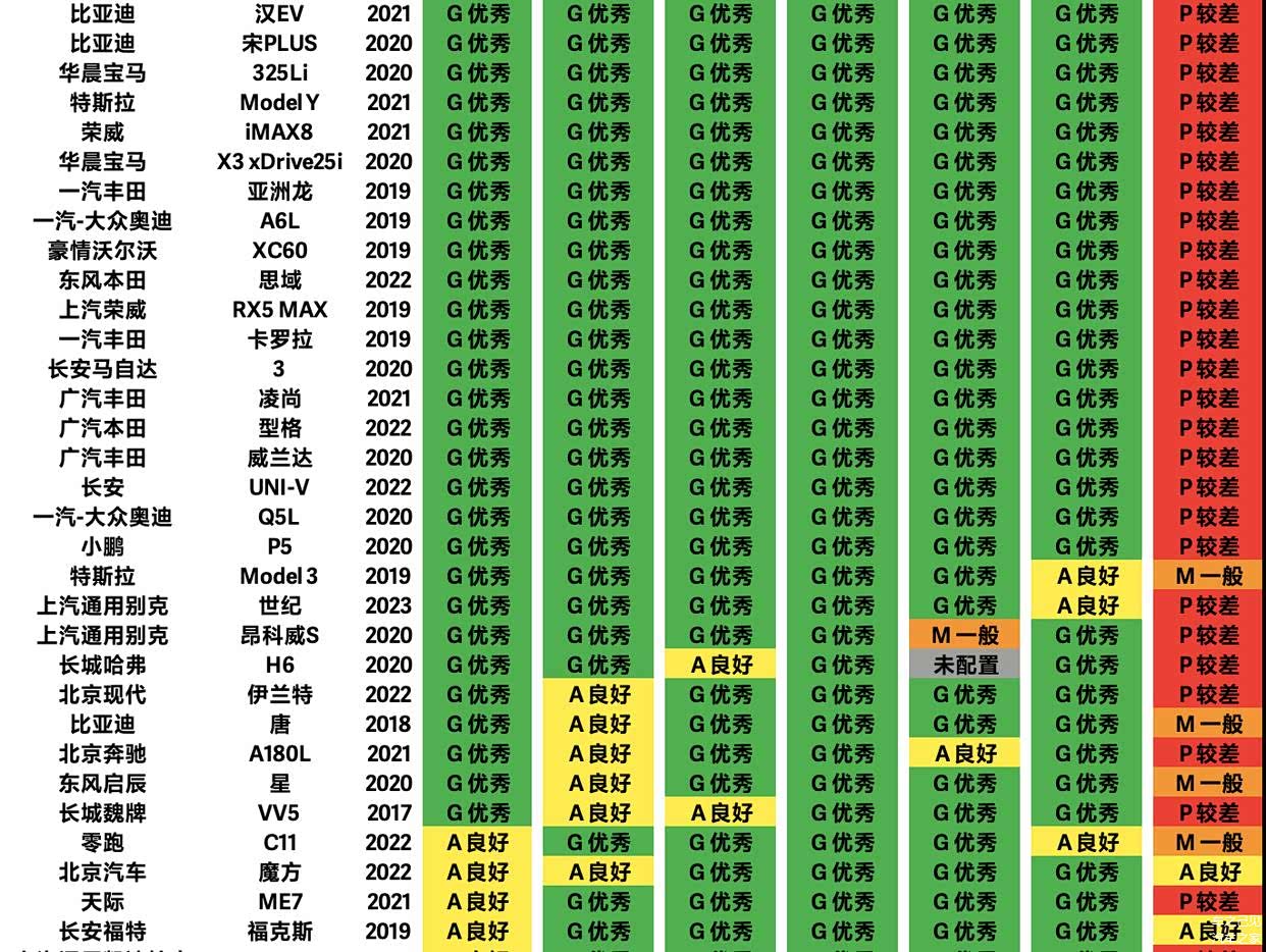 再来看下中保研碰撞成绩排名41-112名的车型,国产车比亚迪宋PLUS、荣威RX5 MAX、长安UNI-V、小鹏P5和哈弗H6等车型的主驾25%碰撞测试也都获得了G级好评。而宝马3系、特斯拉Model Y、丰田亚洲龙、本田思域、丰田卡罗拉和丰田威兰达等主流合资车型,碰撞测试成绩也很出色。当然也有部分车型表现一般,比如此次新增车型北汽魔方,它的主驾25%和侧面碰撞测试都只获得了A级,别克君威、本田雅阁和雪佛兰科鲁泽等车型,也未能全部获得G级。
