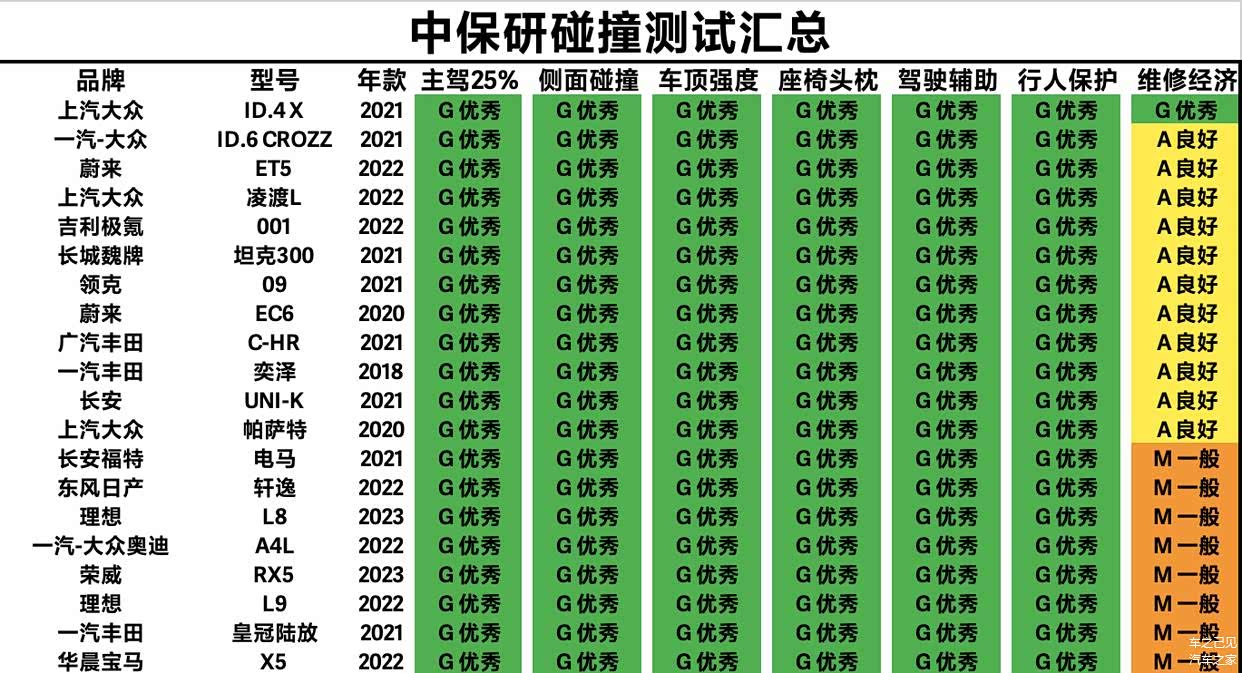 导读:近日,中保研发布了最新一批次的汽车碰撞测试成绩,本期依然有14款新车入榜,其中有13款车型获得了G级好评,包含大众ID.6 CROZZ、福特电马、蔚来ET5、零跑C11、理想L8和极氪001等新能源车型,也包含日产轩逸、大众凌渡L、福特蒙迪欧、奥迪A4L和荣威RX5等燃油车型,而北京魔方获得A级评价。新增13款新车之后,中保研测试的车型数量已达112款,接下来让我们结合榜单,来具体看一下各车型的表现吧!官宣!中保研汽车碰撞成绩最新排名:1-112名,你的车排名第几?
