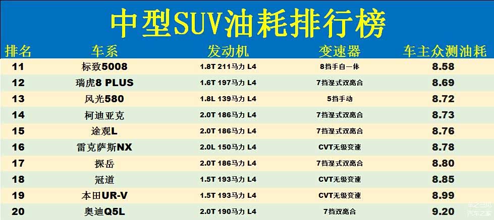 导读:日前获悉,2023年中型SUV车主众测油耗最新排行榜揭晓,本期共有50款主流中型SUV上榜,其中百公里油耗低于9L车型共有19款,包含丰田威飒、大众途观L、 别克昂科威(图片 | 参数 | 询价)、雪佛兰探界者、大众探岳以及本田冠道等主流合资中型SUV,也包含奇瑞瑞虎8、捷途X70、吉利豪越L和风光580等国产中型SUV。主流车型奥迪Q5L、凯迪拉克XT5、宝马X3、奔驰GLC和红旗HS5等,也都是入榜前五十名,丰田汉兰达的百公里油耗也未超过11L。最新!中型SUV油耗排行榜更新:探岳第7,昂科威、瑞虎8前10!