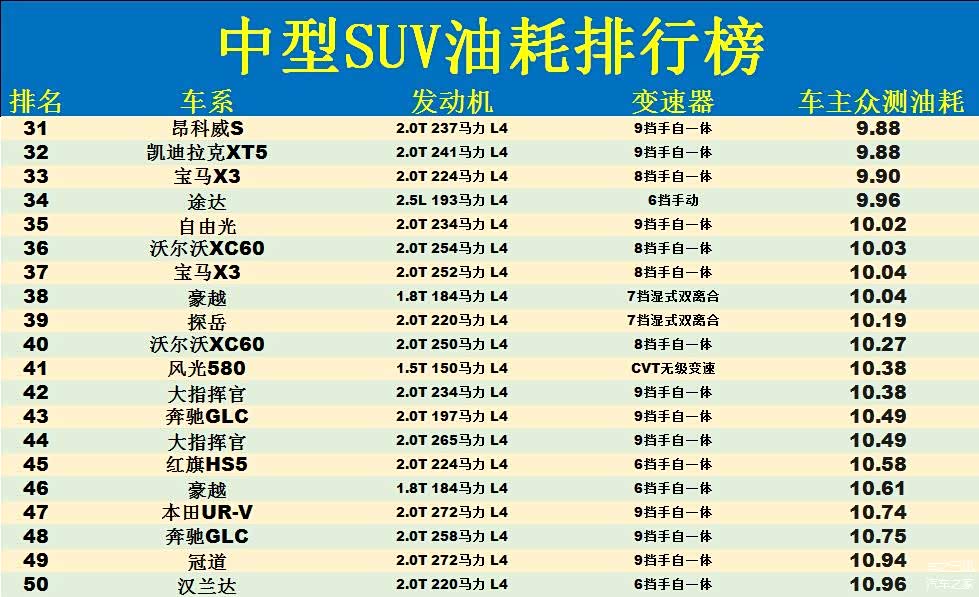 奥迪Q5L排名第20位,它搭载2.0T发动机最大马力为190Ps,百公里油耗只有9.2L,日产楼兰搭载2.5L发动机,百公里油耗在9.5L左右。国产车星途凌云、长安欧尚科赛和长安CS85 COUPE的车主众测油耗也都在10L以内。别克昂科威S、凯迪拉克XT5、宝马X3和日产途达的油耗也未超过10L,自由光、沃尔沃XC60、吉利豪越、大指挥官和红旗HS5的2.0T车型,整体油耗表现也比较不错。丰田汉兰达排名第50位,它搭载2.0T常规功率发动机,最大马力为220Ps,百公里油耗也在11L以内。