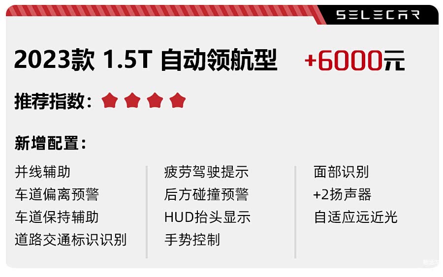 相比之下,再加6000元买1.5T顶配就显得有些不太必要了,因为增加的都是一些非刚需配置。除非你特别需要L2级驾驶辅助功能,不然省下6000元挺好的。