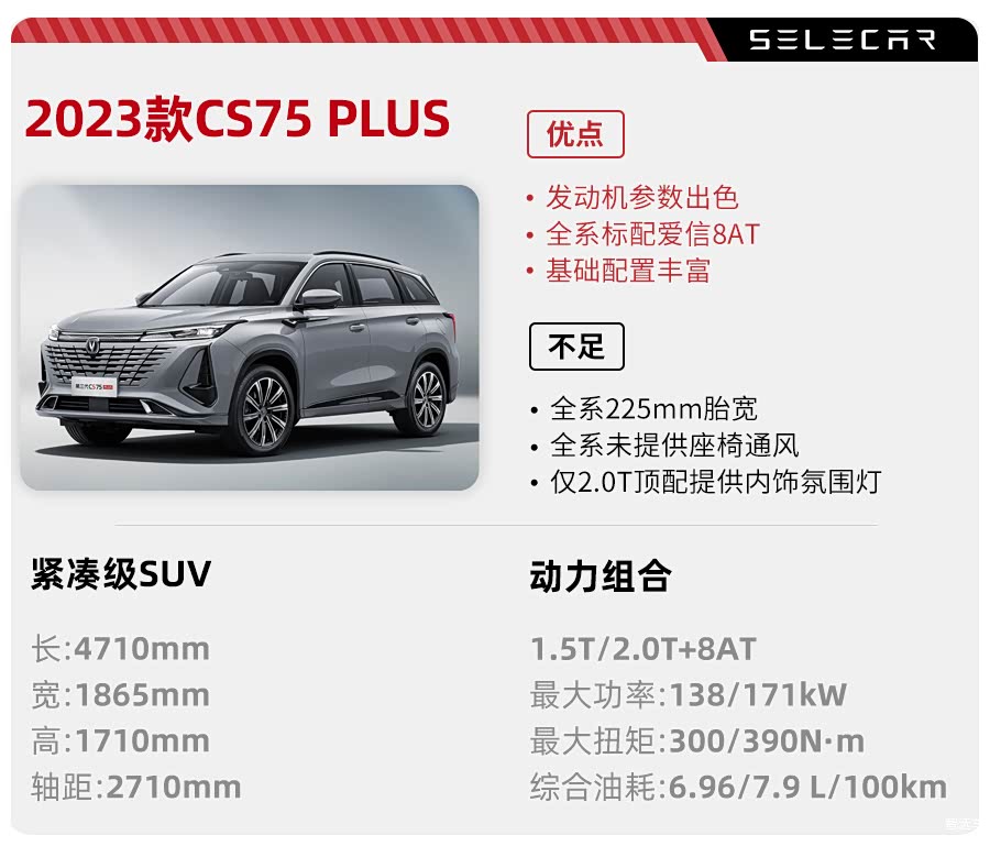 除了全系标配爱信8AT变速箱外,2023款长安CS75 PLUS的发动机参数也很出色,1.5T有188马力和300牛·米,2.0T有233马力和390牛·米。而且无论是1.5T还是2.0T版本,都可以加92号汽油,这点值得好评。