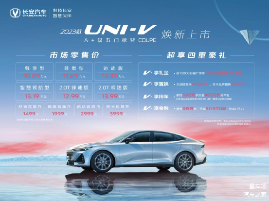 若要给年轻人推荐一台性能颜值俱佳还性价比高的轿车,UNI-V自然是不二之选。近日,2023款UNI-V正式上市,1.5T车型售价区间为10.89万元-13.19万元,2.0T车型售价区间为12.99-13.99万元,整体售价不变,配置却得到了大幅提升,“加量不加价”的2023款UNI-V有哪些亮点呢?