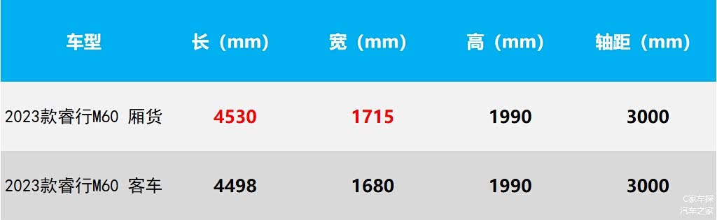 两者的差异点在于,厢货车型仅提供前排两个座椅,后方车厢均为货箱,同时为了扩大货箱装载空间,它在车长和车宽上相比客车车型有所提升,参数分别为4530mm和1715mm,提升分别为32mm和35mm,对于较大、特定尺寸的货物运输更为便利。