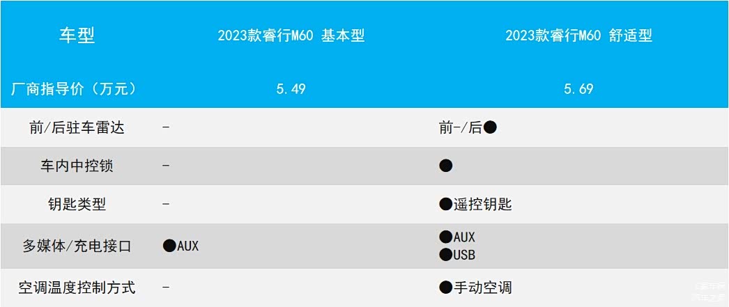 汽油版舒适型相比基本型贵2000元,不过在造型内饰设计、动力总成以及底盘悬架方面,它均与基本型保持一致,两者间差异体现在配置上。舒适型车型相比基本型,提供有后驻车雷达、车内中控锁、遥控钥匙、USB接口以及手动空调。