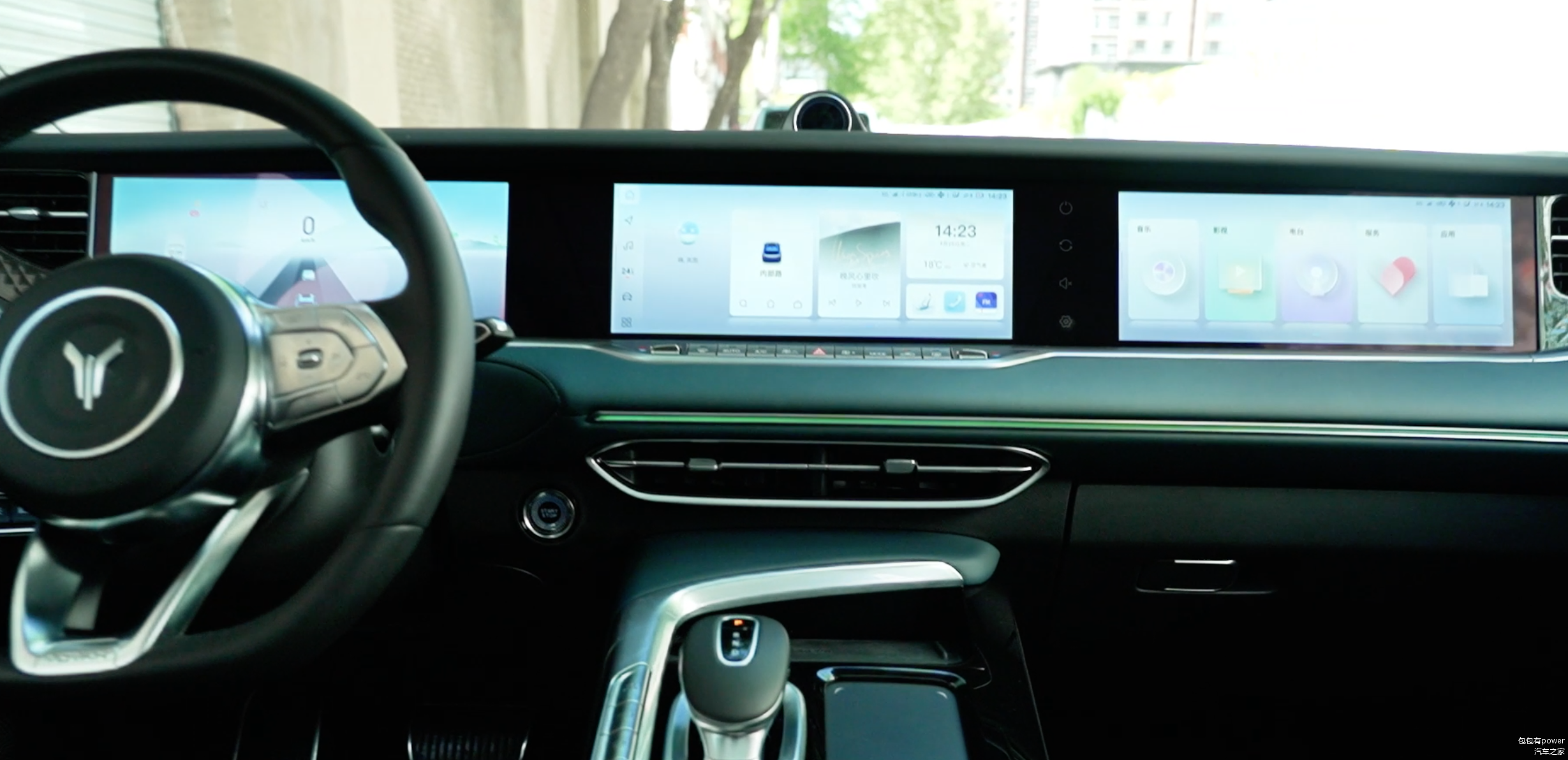 车内最为抢眼的地方,是可升降的中控台设计,这块用三块液晶显示器构成的可升降的中控台,在正常模式下,三块液晶显示器连同平直的仪表板,上升到最高的位置,让显示面积做到最大。在运动模式下,三块液晶显示器连同仪表板下降高度,为驾驶者提供更好的下视野。不得不说,这样的一种布局,还真的是仪式感拉满。