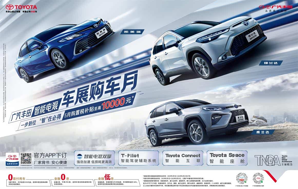 在活动期间,消费者购车即可享最高10000元的购置税补贴以及至高8000元的置换补贴(*更多具体优惠政策及详情,敬请咨询广汽丰田当地经销商),并且还可享2年金融0息、至高10万元3年金融低息、月付2236元起0首付用车在内的三大金融政策。此次优惠车型范围广,包括明星车型凯美瑞、威兰达、雷凌、威飒和锋兰达,以及前4款车型的智能电混双擎版都在优惠清单中。