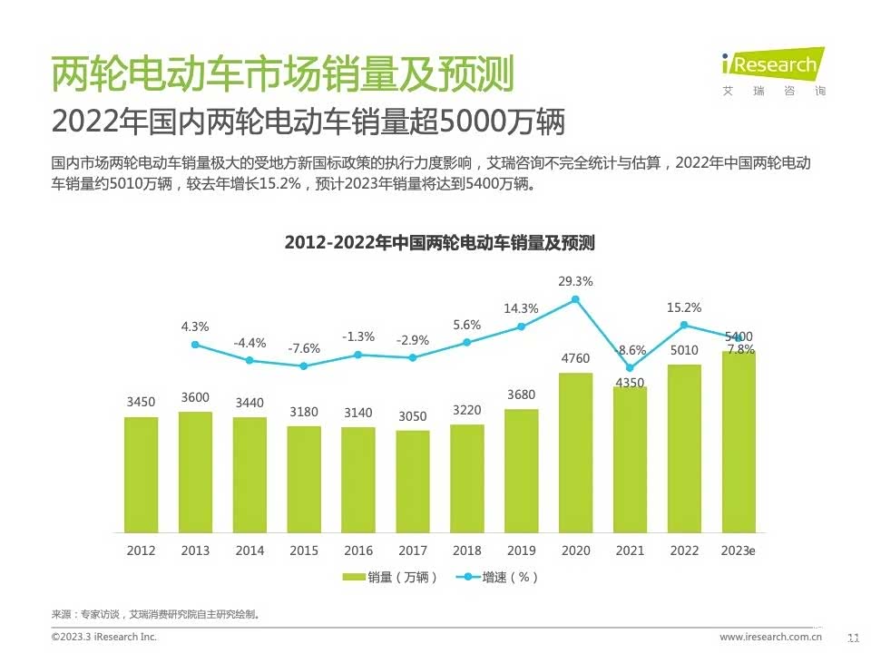 根据艾瑞咨询的调研报告,在 2022 年,中国市场总共售出了约 5010 万辆两轮电动车,较前一年增长 15.2%,这个数字有可能在 2023 年达到约 5400 万辆。