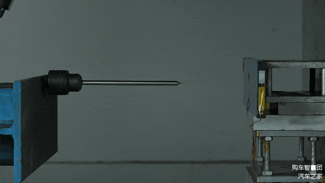 本次试验选用一根直径8mm、顶角45°的钢针进行针刺。相比陶瓷等其他材料,钢针具备更好的导电性能,可以加剧针刺后电池短路的严苛程度,更贴近实际破坏工况。钢针45°的顶角,可以在增加短路面积的同时,又保证能刺穿电池,不被短路电流熔断,尽可能对神盾电池造成长时间、大面积的剧烈破坏。