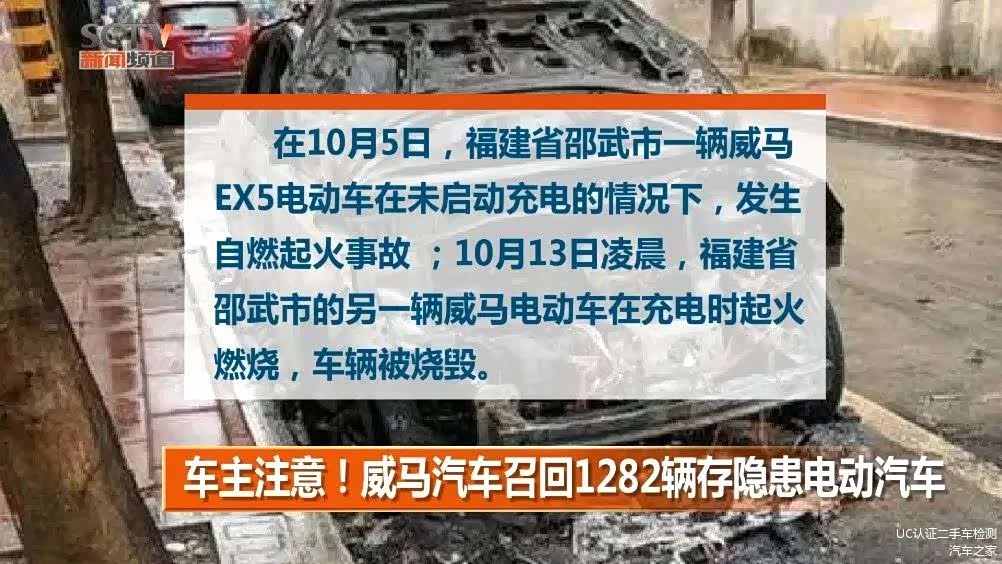 2019年9月23日,一辆威马EX5在温州某路段突然起火。据车主反映,首先是扶手箱和座椅开始冒烟,然后内部燃烧起来,最后蔓延到全车。