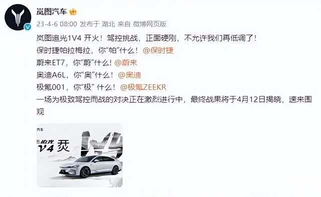 今年4月份,岚图官方发布了一条微博,分别艾特了保时捷、蔚来、奥迪、极氪,言语中也充满着挑衅意味。无一例外,这些都是高端品牌。