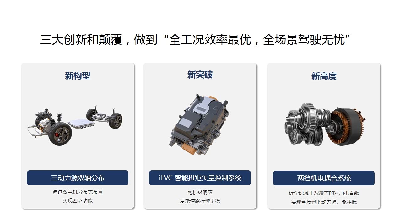 这套混动技术还配备了iTVC智能扭矩矢量控制系统,通过前后双电机的动力解耦与扭矩动态分配,快速对前后轴扭矩进行分配及动态调节,能够最大程度保证四个车轮的附着力,从而提升日常驾驶的稳定性和极端路况的通过性。