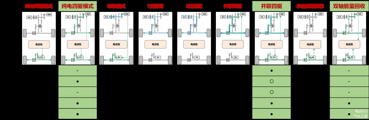 具体来讲,长城Hi4智能四驱电混技术在驱动形式发生变化之后,变成了串并联+2挡+前后轴双电机架构,相比上一代增加了纯电四驱、并联四驱以及两轴能量回收模式,真正实现了“三擎九模”,从而满足更多的用车场景。