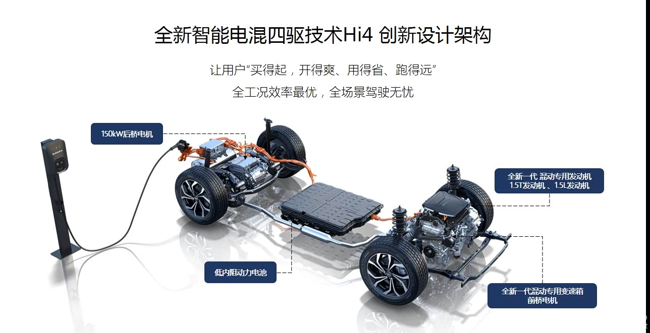 首先来介绍一下长城哈弗发布的这个Hi4智能四驱电混技术,正如其名,H(Hybrid)代表混动,i(intelligent)代表智能,4代表(4WD)四驱系统,这也是这套混动技术最核心的价值所在。