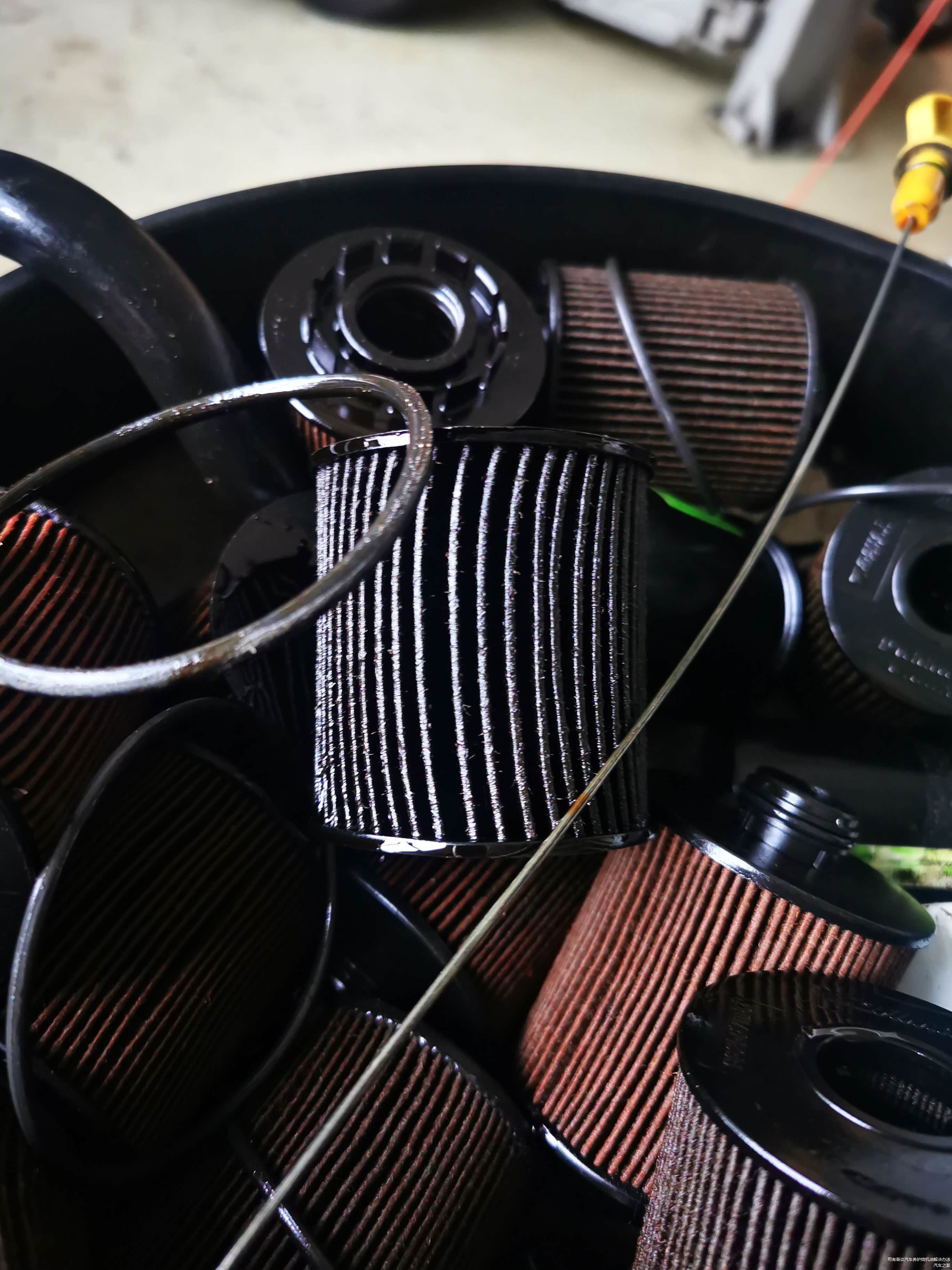 机滤依旧比正常的机滤黑,说明这次积碳又清理出不少。中间最黑的机滤就是刚换下的旧机滤。