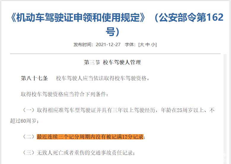 现在越来越多的学校为了方便学生上学都配备了校车,而校车司机也是一份非常简单轻松且待遇不错的工作,所以很多人都非常向往。但是想要开校车也是具有一些门槛,首先就是得依法取得校车驾驶资格,其中在申请校车驾驶资格条件中就包含了“最近连续三个记分周期没有被记满12分记录”,这也是为了保证校车驾驶员的驾驶技术以及交通安全意识,保障学生的安全。