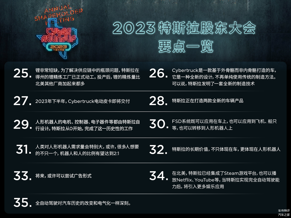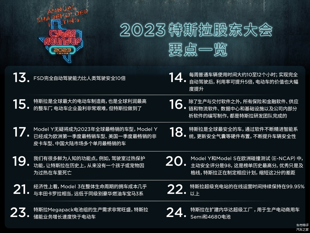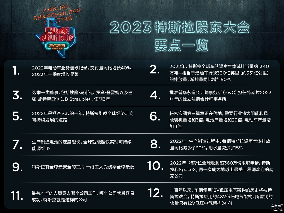 关于未来,马斯克在股东大会上也给出了清晰的规划,特斯拉将在电池、电动车生产(包括下一代平台)、锂精炼厂建设、储能工厂、销售和服务足迹以及充电网络等领域持续投入。显然,特斯拉也需要长期主义的投资者。