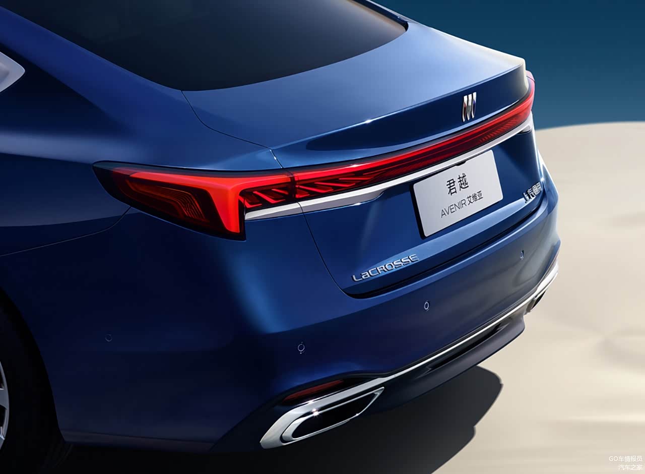尾部的灯光是贯穿式的设计,和银色的镀铬饰条融合在一起。底部给了两边双出的排气管,带有一定的下护板造型,符合君越在这个级别的定位。
