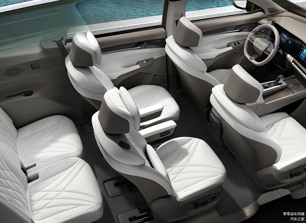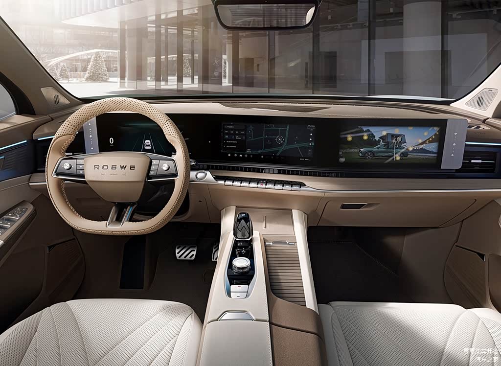 转至车厢,RX9整体车内造型以大气沉稳为主,双色拼搭加上质感出众的木纹饰板等工艺设计,塑造出高档氛围。而最有亮点的地方,当属全液晶仪表盘+中控屏+副驾娱乐屏组成的47英寸贯通屏设计,屏幕全系标配高通骁龙8155芯片,内置洛神智能多媒体系统,全系配备高德地图、语音识别以及车联网等功能,可惜没有OTA升级。