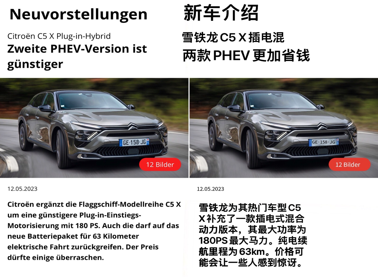 “雪铁龙为其热门车型C5 X补充了一款插电式混合动力版本,其最大功率为180PS最大马力。纯电续航里程为63km。价格可能会让一些人感到惊讶。”