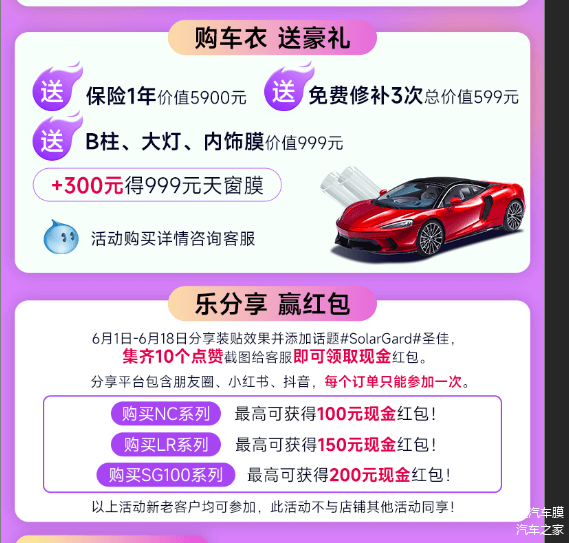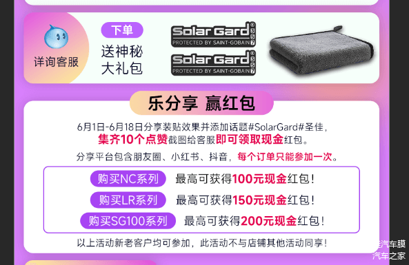 另外,圣佳膜小编还要值得一提的是,重磅现金红包活动也来了:6月1-6月18号各位车主朋友们分享装贴圣佳品牌的汽车膜效果图片并添加#SolarGard圣佳#话题分享在朋友圈、小红书、抖音等社交平台上,最高可获得200的现金红包。