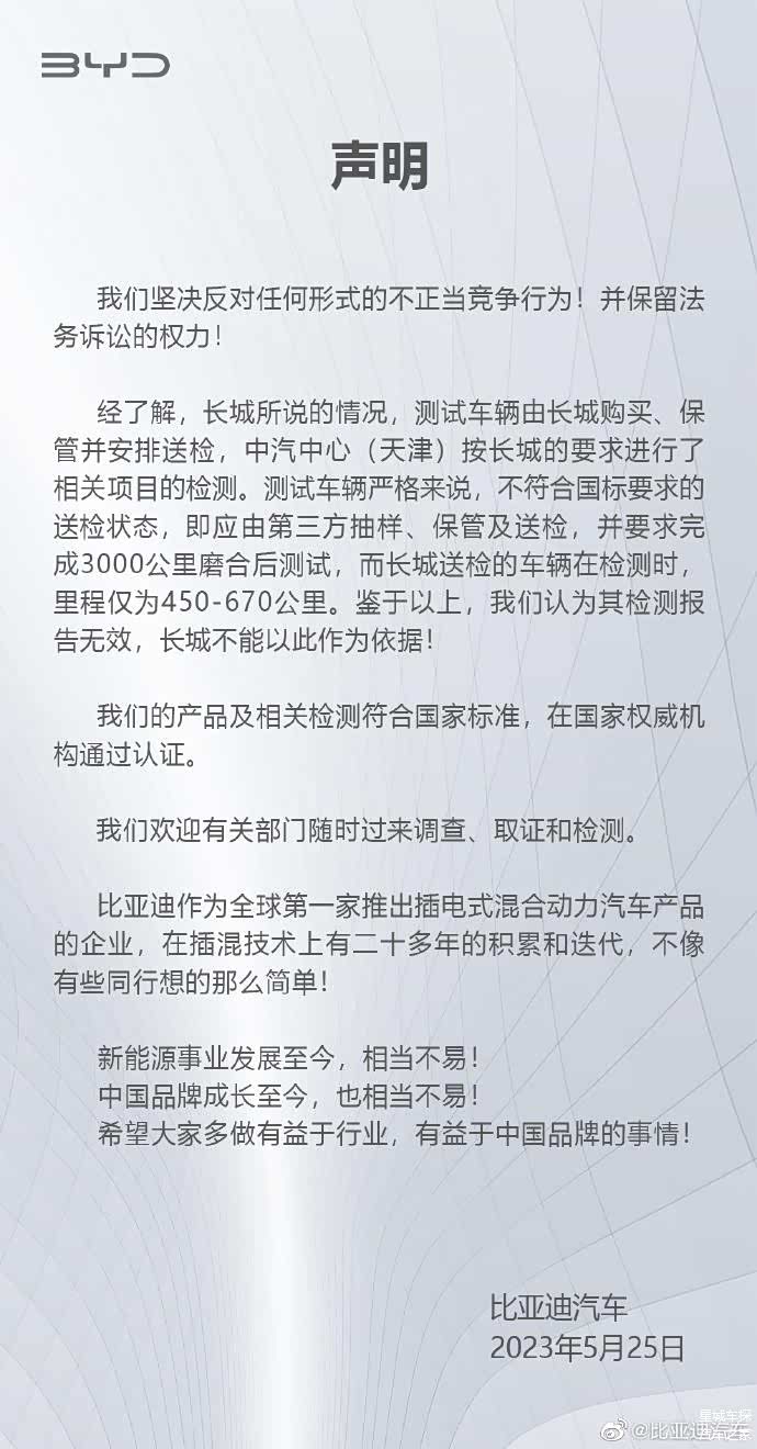 比亚迪当然也不是吃干饭的,当然要出声啦!不然这瓜,我们怎么吃。比亚迪说:“长城汽车单方面采购产品并进行送检试验,不符合国家标准试验要求。比亚迪认为检测无效,不能做为举报依据”。只能说,比亚迪这回复好软啊!